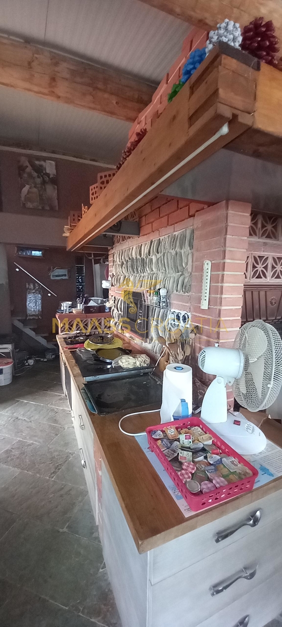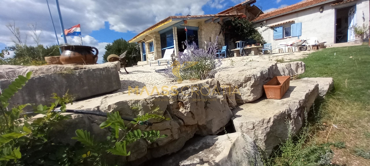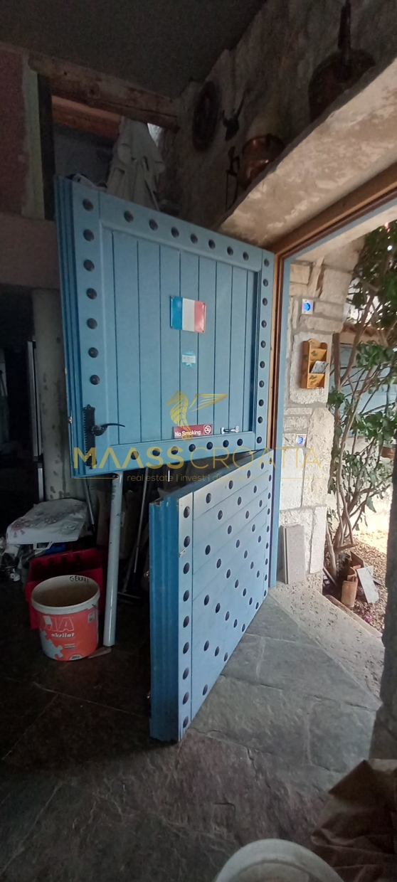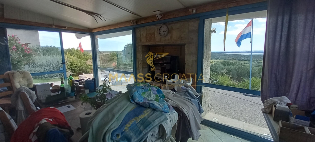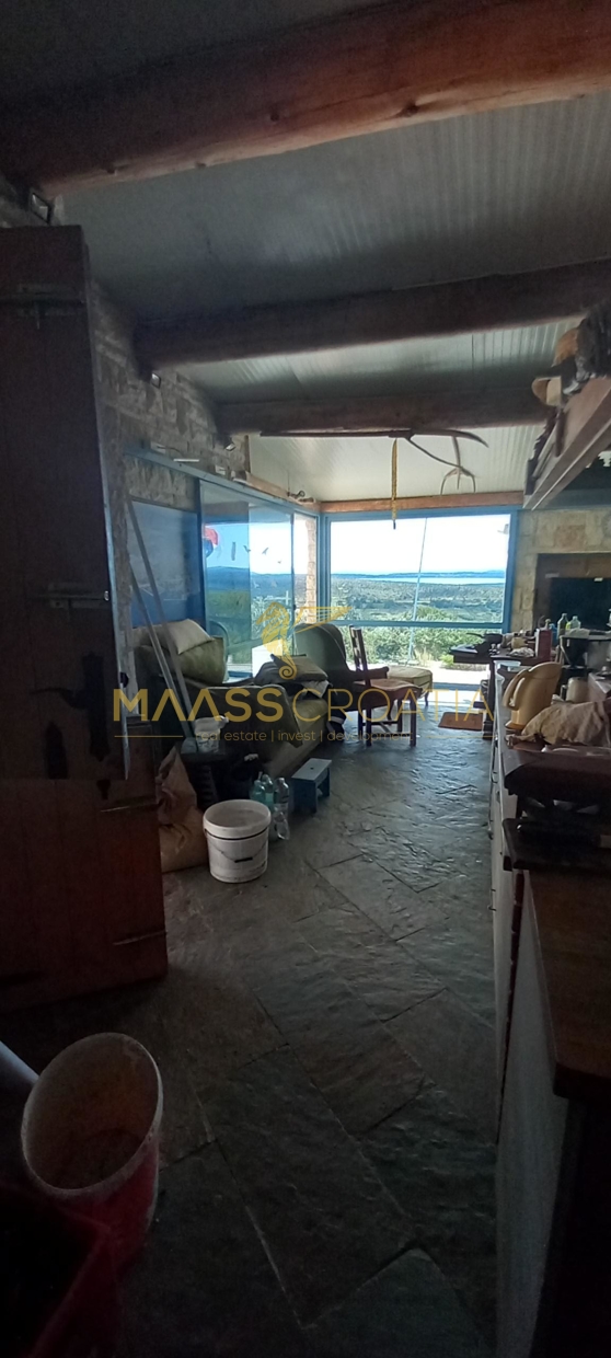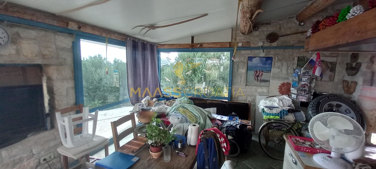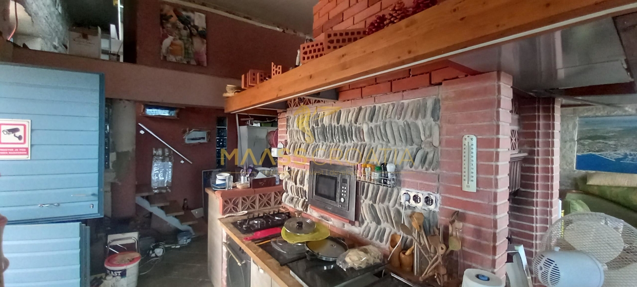 В здание 2 можно попасть как со стороны бассейна, так и со стороны, примыкающей к зданию 1. Здесь вы найдете сокровищницу произведений искусства ручной работы, креативных идей по обустройству и камней, собранных самостоятельно, которые украшают заднюю стену кухни. Все создано самим владельцем и творчески оформлено с большим вниманием к деталям. Безусловной изюминкой является кухонный остров в центре помещения, вокруг которого приходится “работать” при приготовлении пищи, поскольку с одной стороны острова находится мойка с рабочей поверхностью вокруг нее, с другой – варочная панель и духовой шкаф, а на стороне, обращенной к диванной зоне и панорамным окнам, – дровяная печь для отопления. С этой зоны, как с трона, открывается поистине захватывающий вид на деревню, а также на Пакостане, озеро Врана и море.