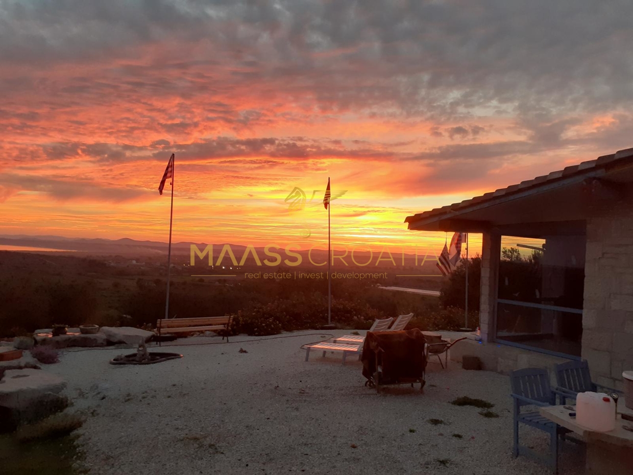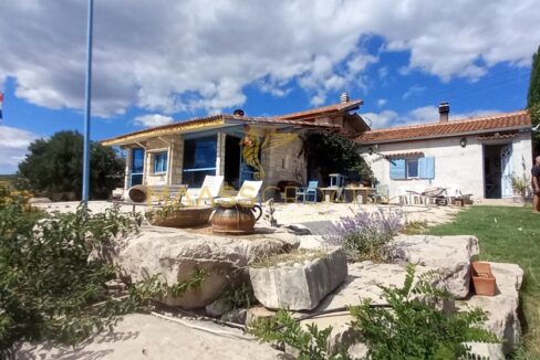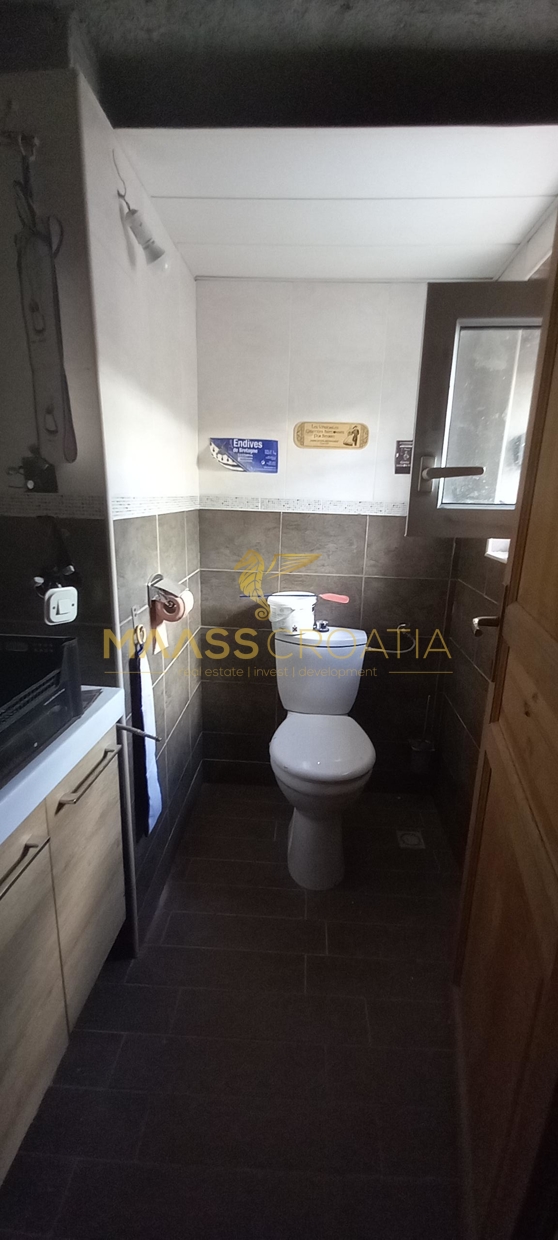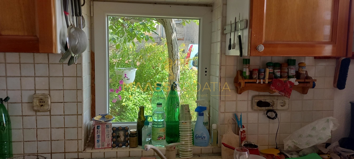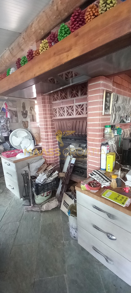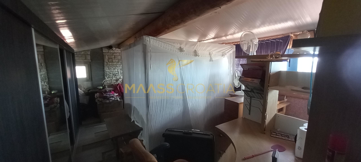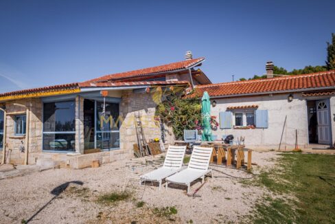 В здание 2 можно попасть как со стороны бассейна, так и со стороны, примыкающей к зданию 1. Здесь вы найдете сокровищницу произведений искусства ручной работы, креативных идей по обустройству и камней, собранных самостоятельно, которые украшают заднюю стену кухни. Все создано самим владельцем и творчески оформлено с большим вниманием к деталям. Безусловной изюминкой является кухонный остров в центре помещения, вокруг которого приходится “работать” при приготовлении пищи, поскольку с одной стороны острова находится мойка с рабочей поверхностью вокруг нее, с другой – варочная панель и духовой шкаф, а на стороне, обращенной к диванной зоне и панорамным окнам, – дровяная печь для отопления. С этой зоны, как с трона, открывается поистине захватывающий вид на деревню, а также на Пакостане, озеро Врана и море.