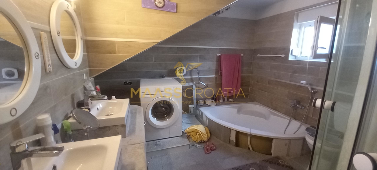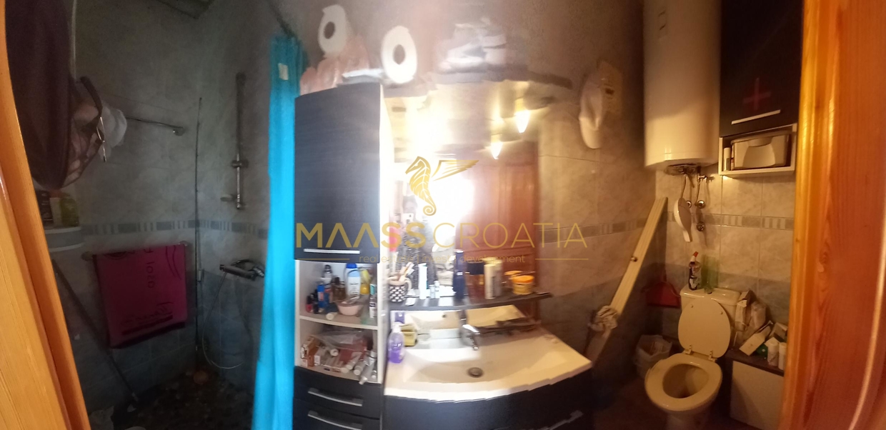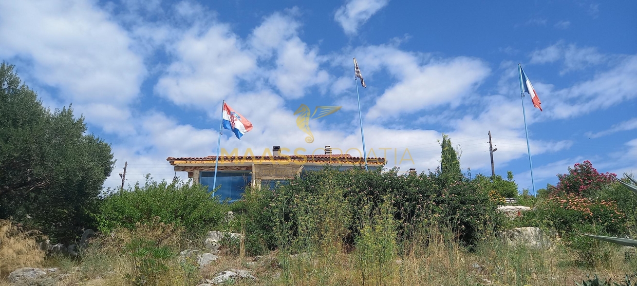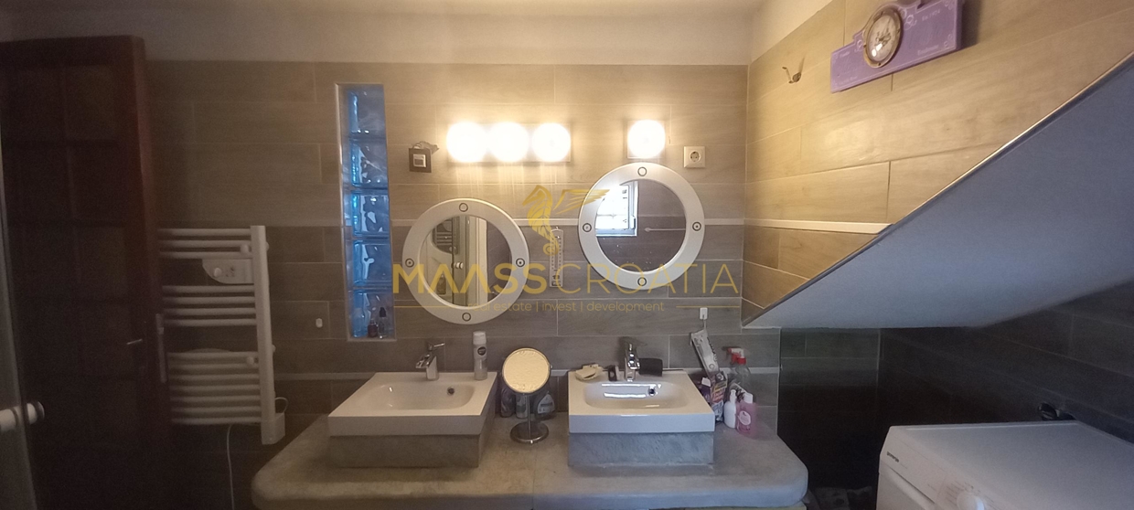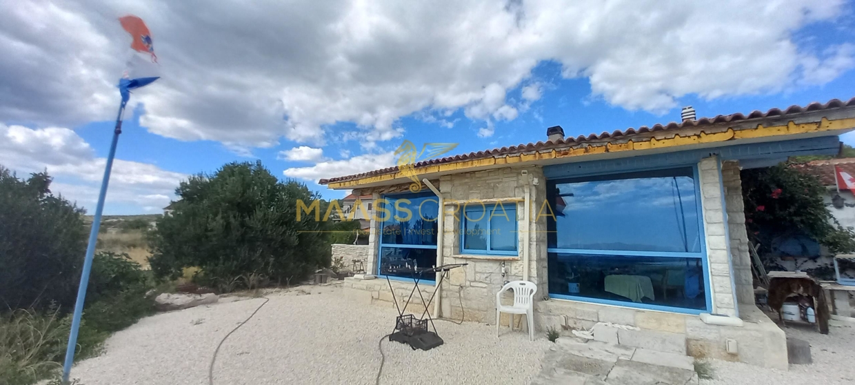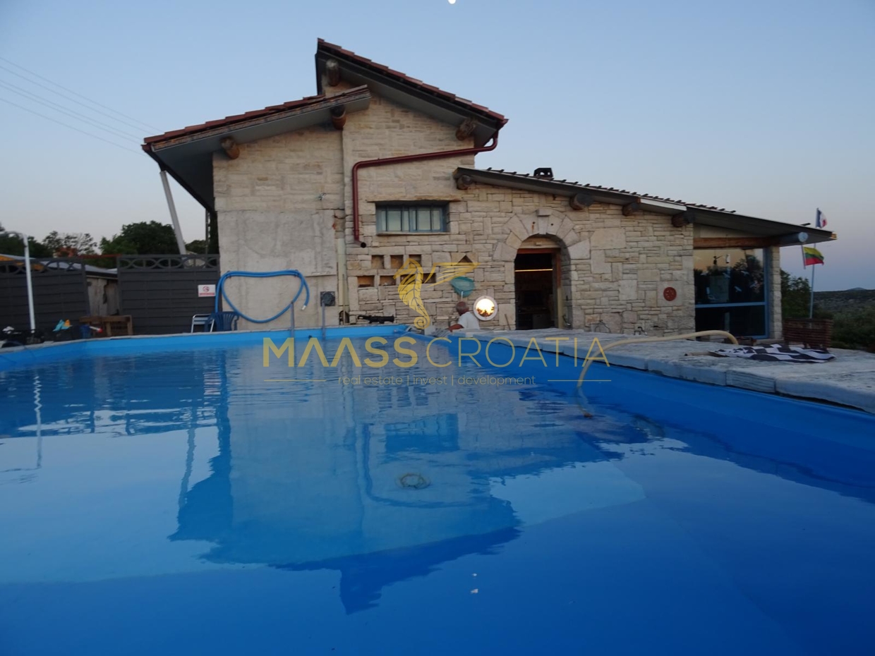 В здание 2 можно попасть как со стороны бассейна, так и со стороны, примыкающей к зданию 1. Здесь вы найдете сокровищницу произведений искусства ручной работы, креативных идей по обустройству и камней, собранных самостоятельно, которые украшают заднюю стену кухни. Все создано самим владельцем и творчески оформлено с большим вниманием к деталям. Безусловной изюминкой является кухонный остров в центре помещения, вокруг которого приходится “работать” при приготовлении пищи, поскольку с одной стороны острова находится мойка с рабочей поверхностью вокруг нее, с другой – варочная панель и духовой шкаф, а на стороне, обращенной к диванной зоне и панорамным окнам, – дровяная печь для отопления. С этой зоны, как с трона, открывается поистине захватывающий вид на деревню, а также на Пакостане, озеро Врана и море.
