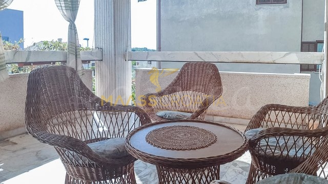 На втором этаже находится большая квартира с двумя спальнями, состоящая из просторной гостиной с прямым выходом на красивую террасу, кухни со столовой, двух спален и ванной комнаты.