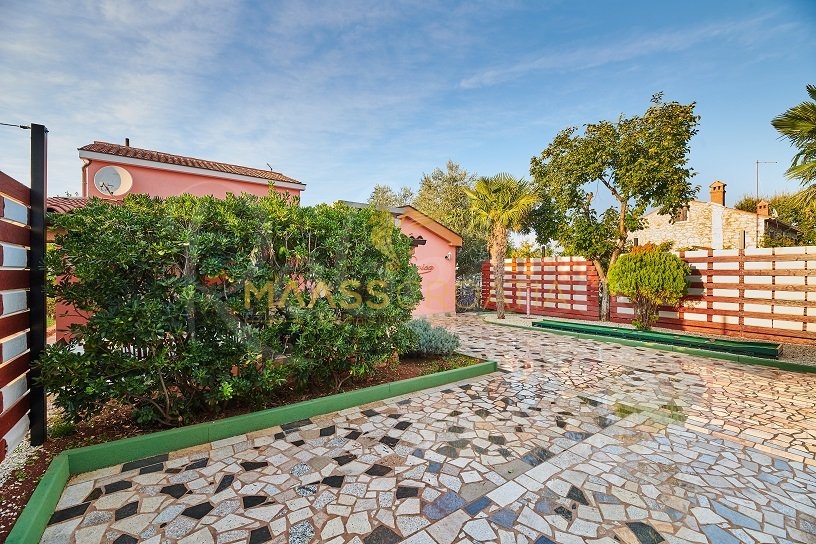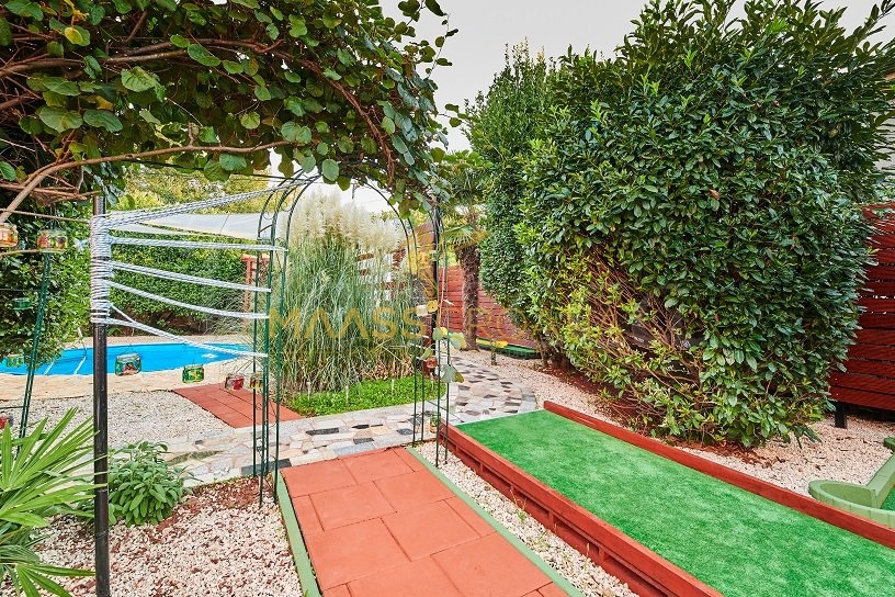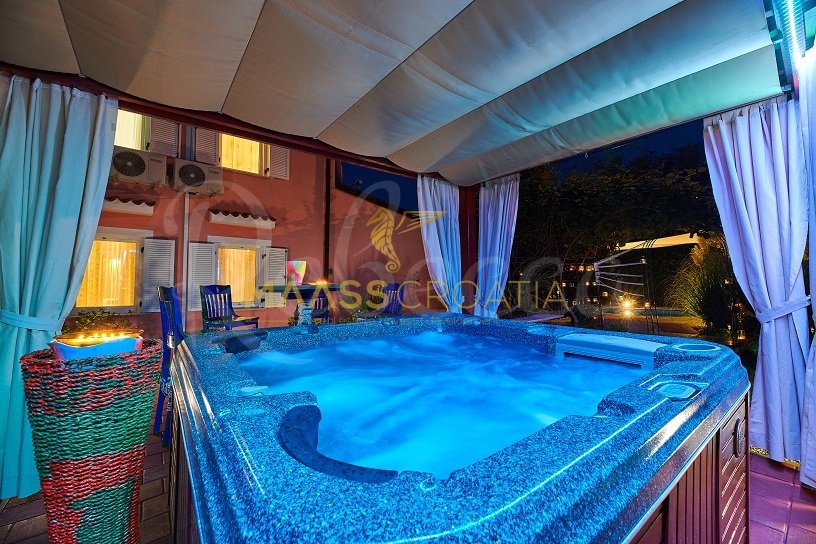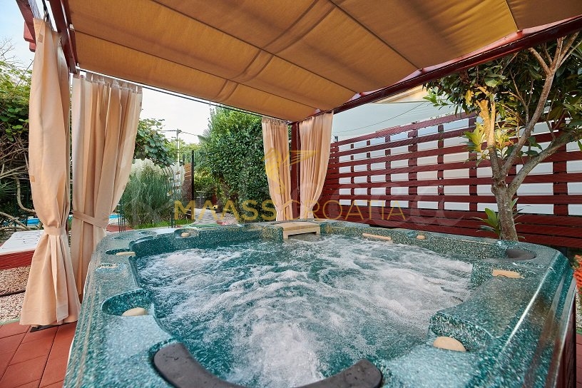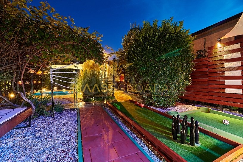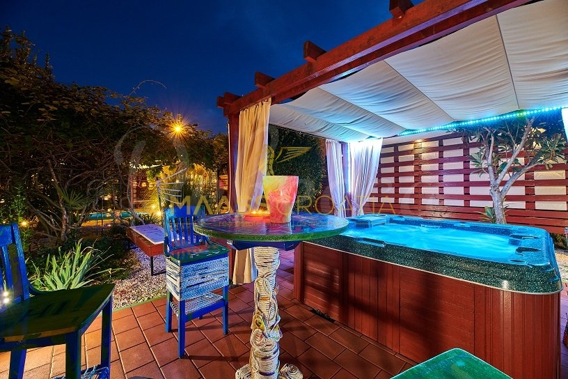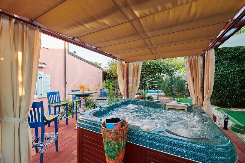 Вилла окружена участком площадью около 700 м², на котором есть бассейн, отдельное крытое и освещенное джакузи и дополнительные объекты для отдыха и релаксации, такие как мини-гольф и бассейн для ног, все в окружении красивых средиземноморских растений (оливки, инжир, вишня, лавр и т.д.).