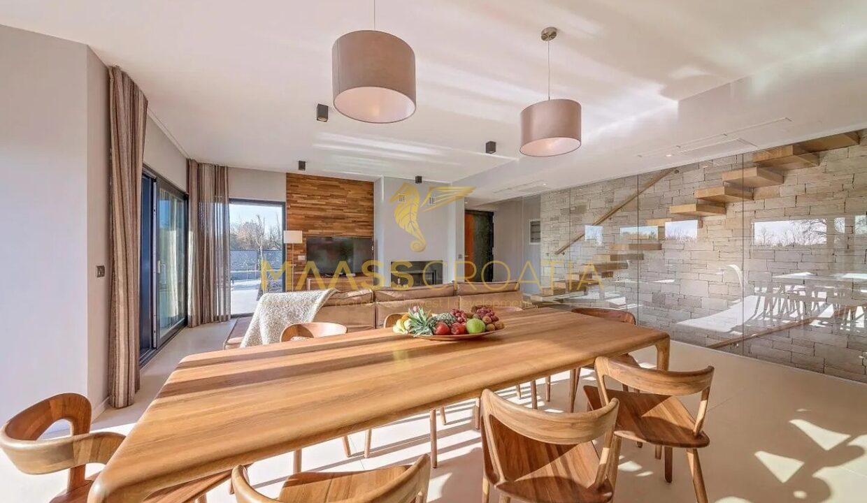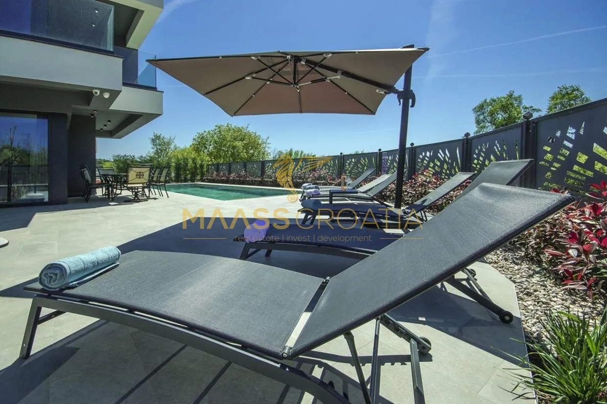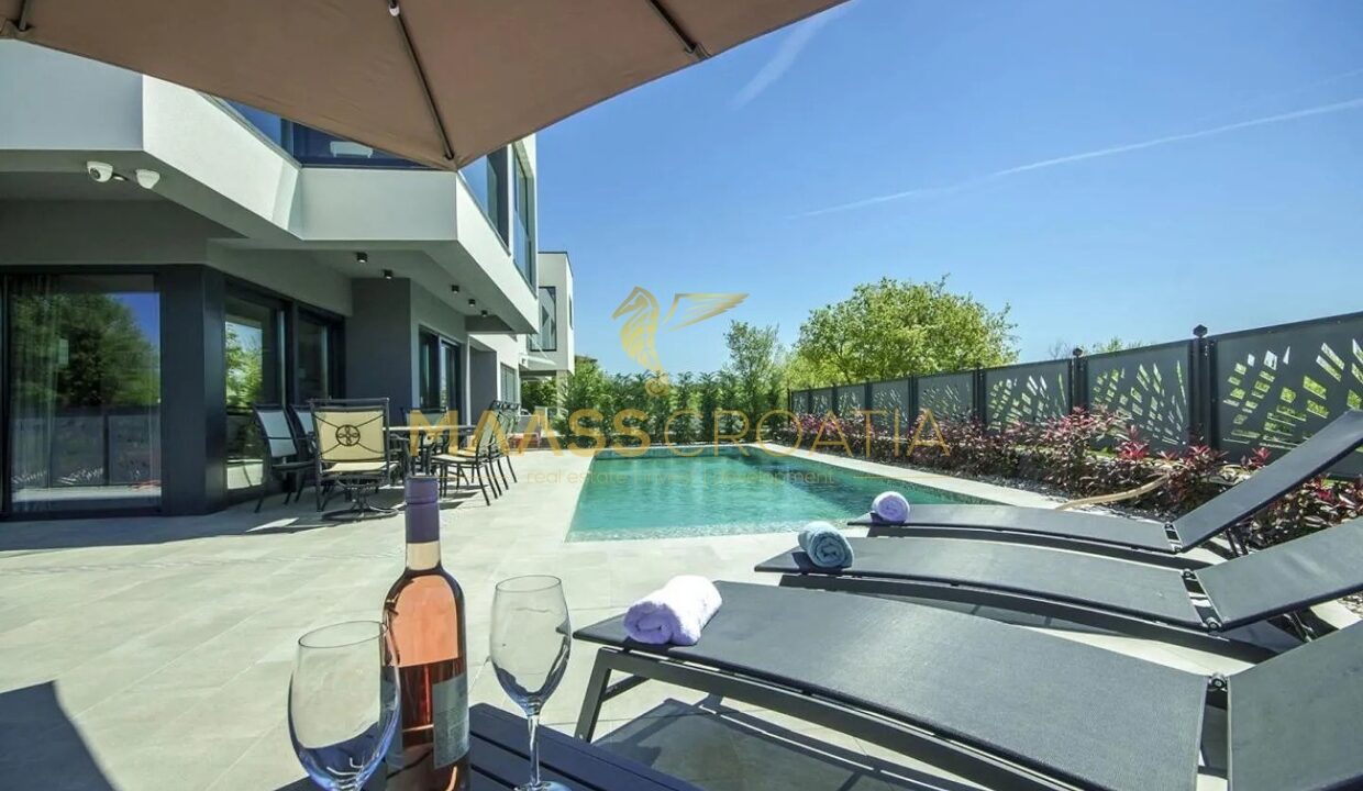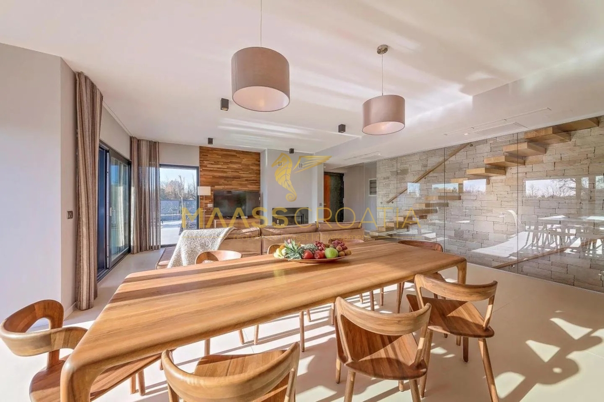 Эта элегантная вилла расположена в тихом месте в Порече, всего в 800 метрах от моря, и предлагает идеальное сочетание уединения, комфорта и близости ко всем удобствам.