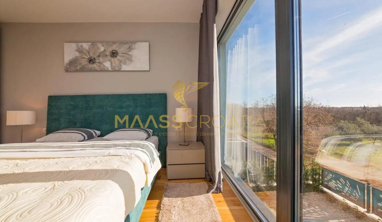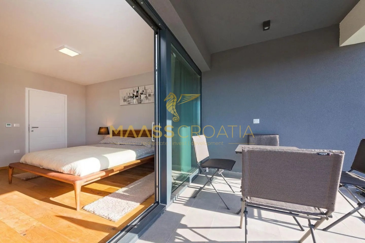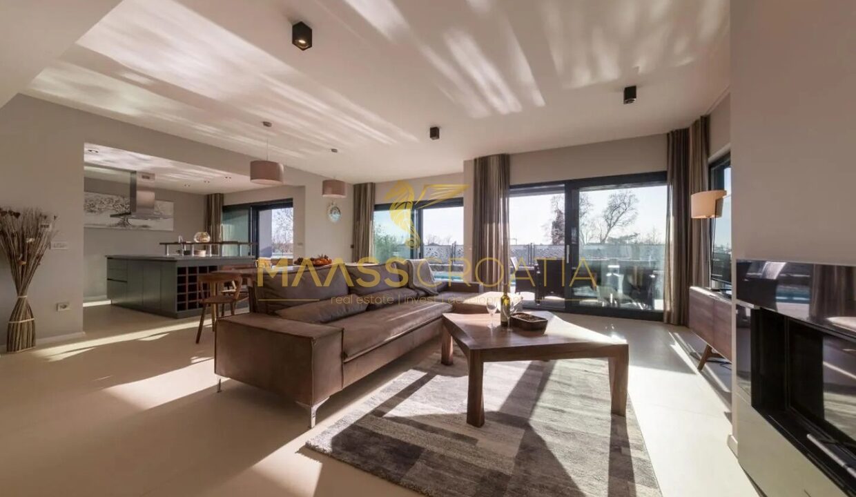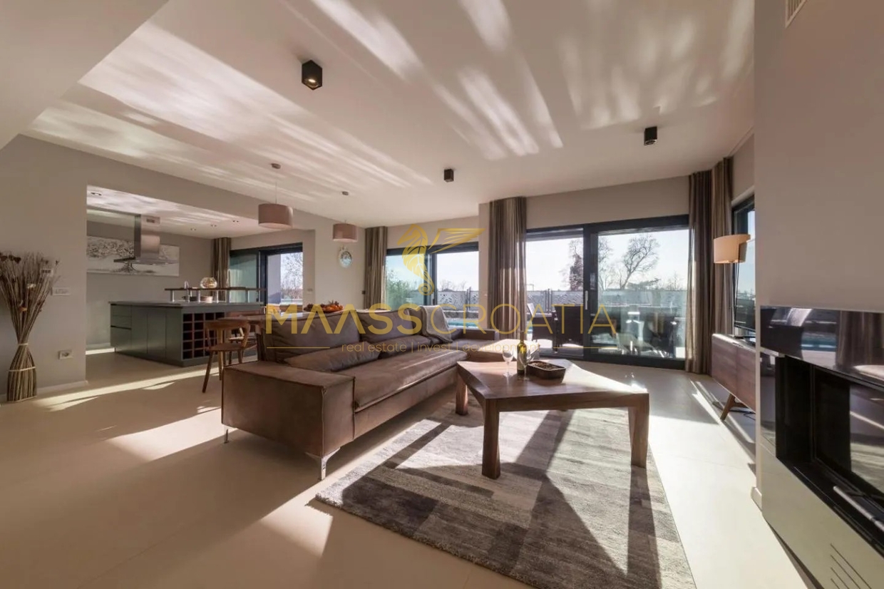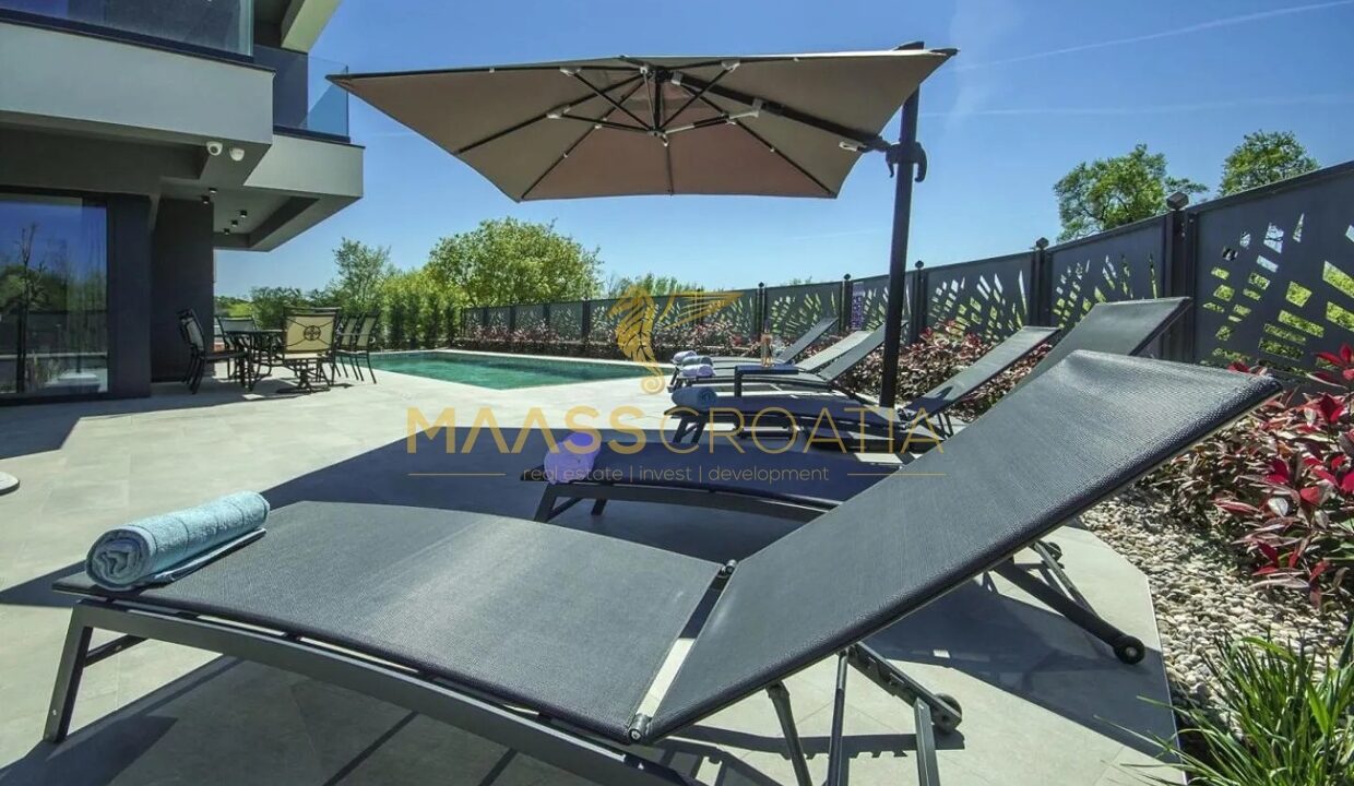 Эта элегантная вилла расположена в тихом месте в Порече, всего в 800 метрах от моря, и предлагает идеальное сочетание уединения, комфорта и близости ко всем удобствам.