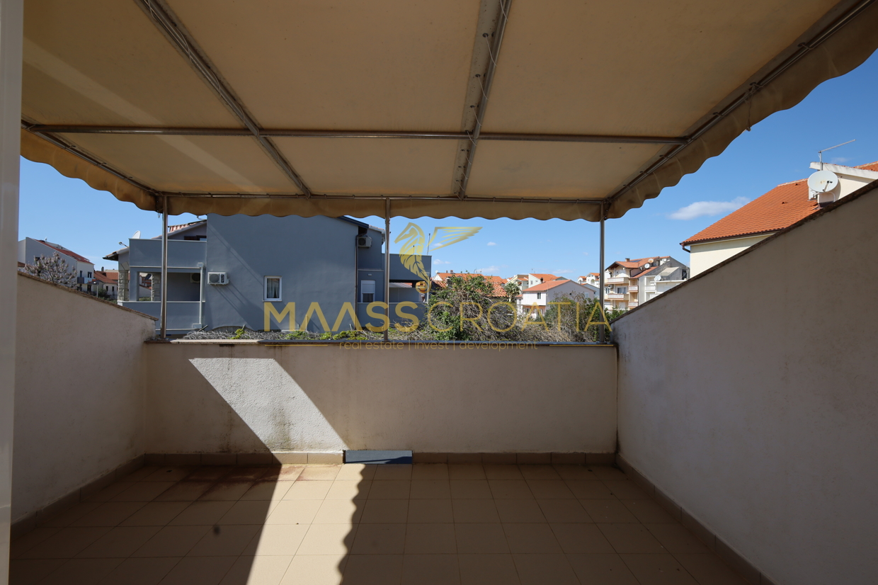 Внутренняя лестница ведет на 1 этаж, где расположены кухня с обеденной зоной, спальня с террасой, прихожая с балконом и ванная комната.