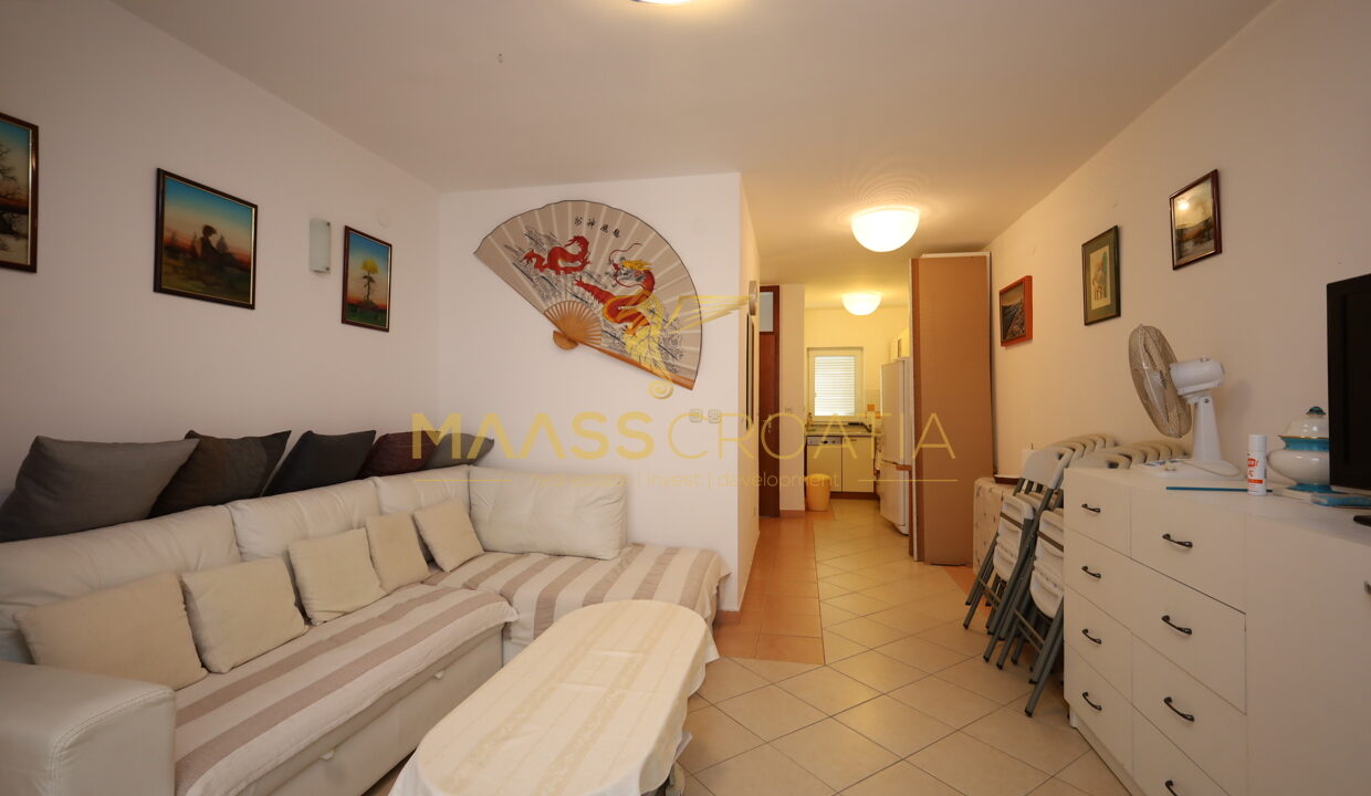 На первом этаже расположены прихожая, ванная комната, кухня, столовая и гостиная с выходом на террасу площадью 13,69 м² и мощеный двор площадью 17,15 м², которые образуют единое целое.