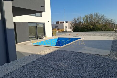 На первом этаже находится ванная комната, большая и удобная кухня с гостиной открытого плана. Отсюда есть выход на террасу и к бассейну площадью 35 м².