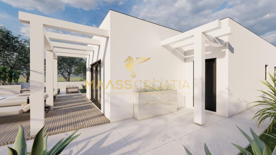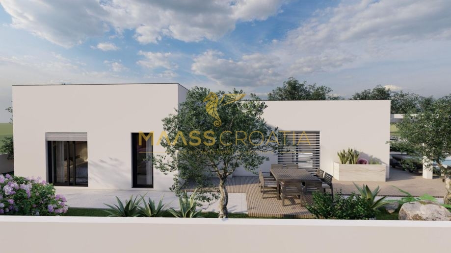 Современное бунгало для семьи строится здесь, в очень тихом месте на окраине деревни, посреди оливковой рощи.