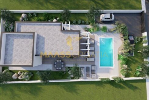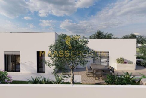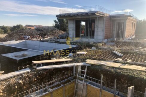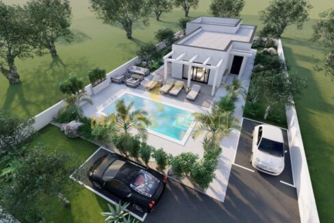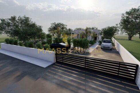 Современное бунгало для семьи строится здесь, в очень тихом месте на окраине деревни, посреди оливковой рощи.