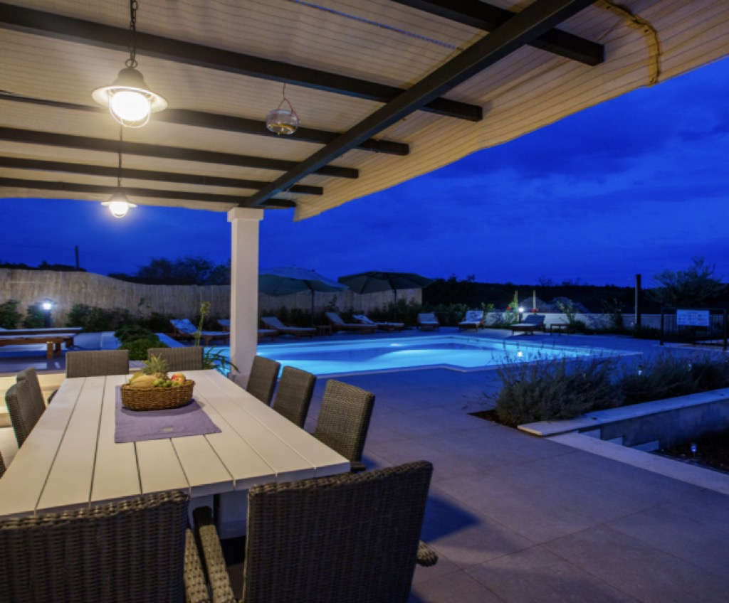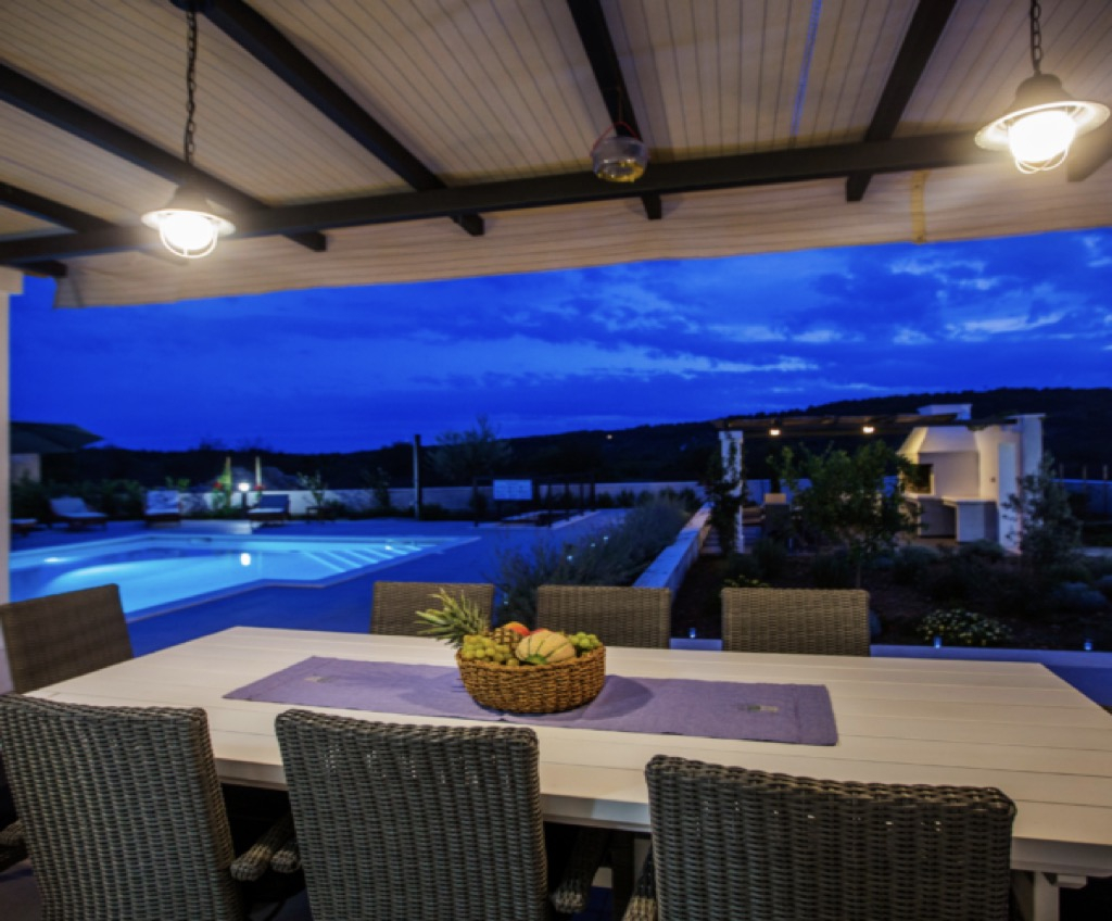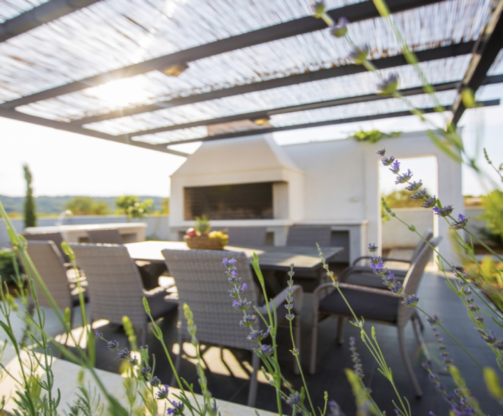 Чуть дальше от главной террасы на первом этаже, которая соединена с домом, есть еще одна зона отдыха с открытой кухней, также покрытая функциональной и красивой перголой.