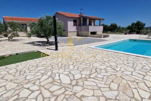 На участке расположены больший и меньший каменные дома, большой сад с бассейном и зона для общения у бассейна.