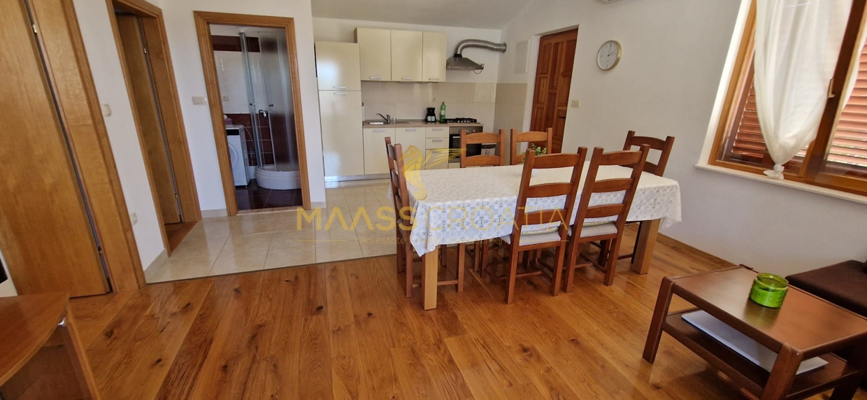 На верхнем первом этаже находится красивая меблированная квартира с кухней, столовой, гостиной, двумя спальнями, ванной комнатой и балконом.