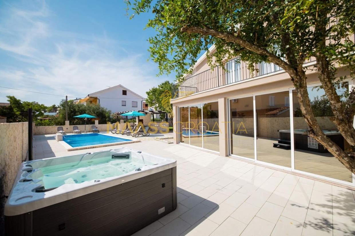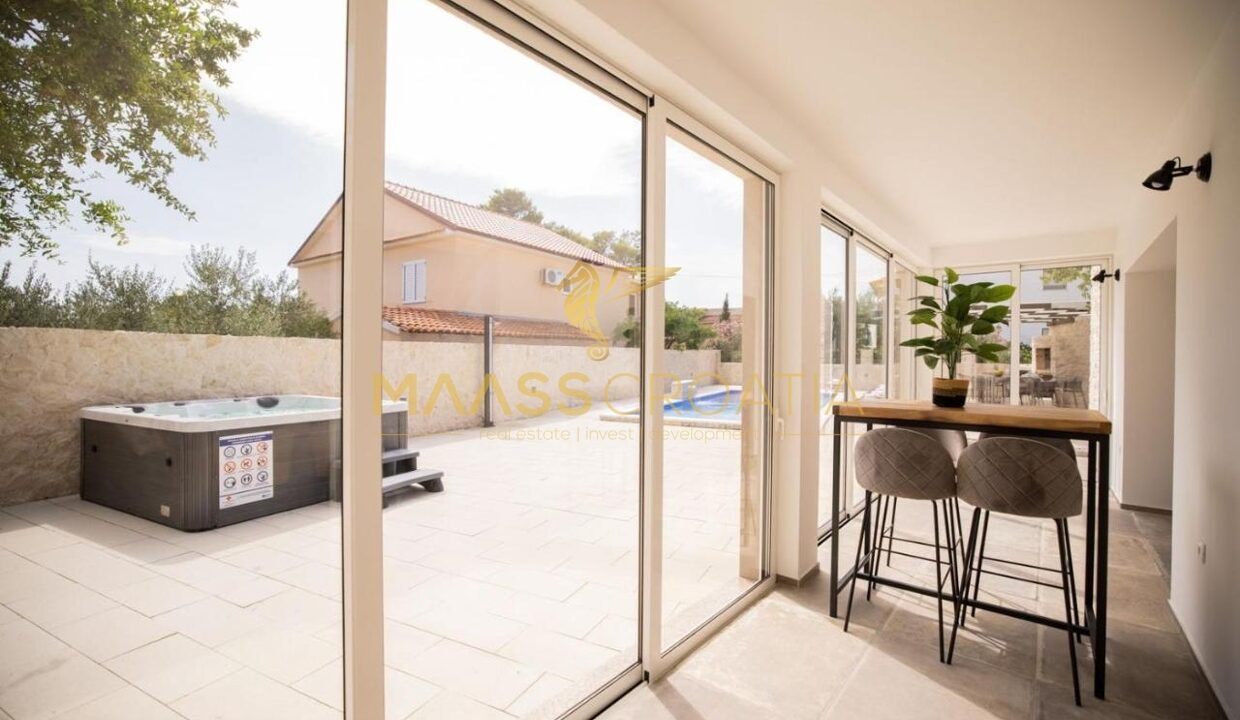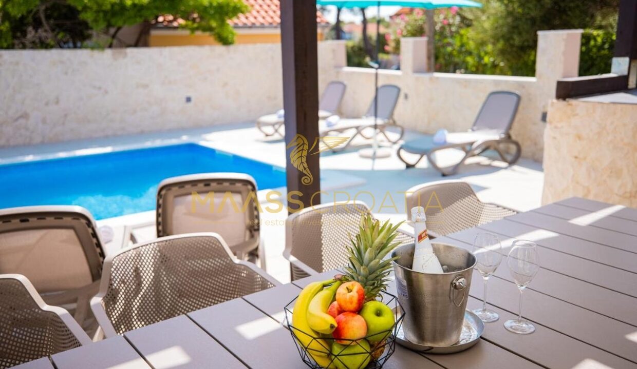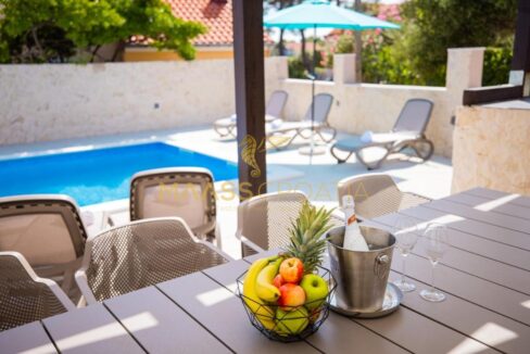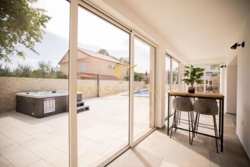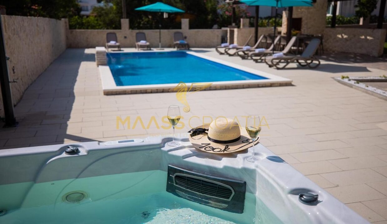 Перед виллой находится открытый бассейн с подогревом, шезлонгами и зонтиками, большое джакузи на 5 человек, зона для барбекю и уютный стол на 10 человек. Вилла расположена на полностью огороженном участке площадью 575 м² с высотой забора 130-180 см и зеленой зоной с различными породами деревьев и другими деталями, такими как камень Бенковац.