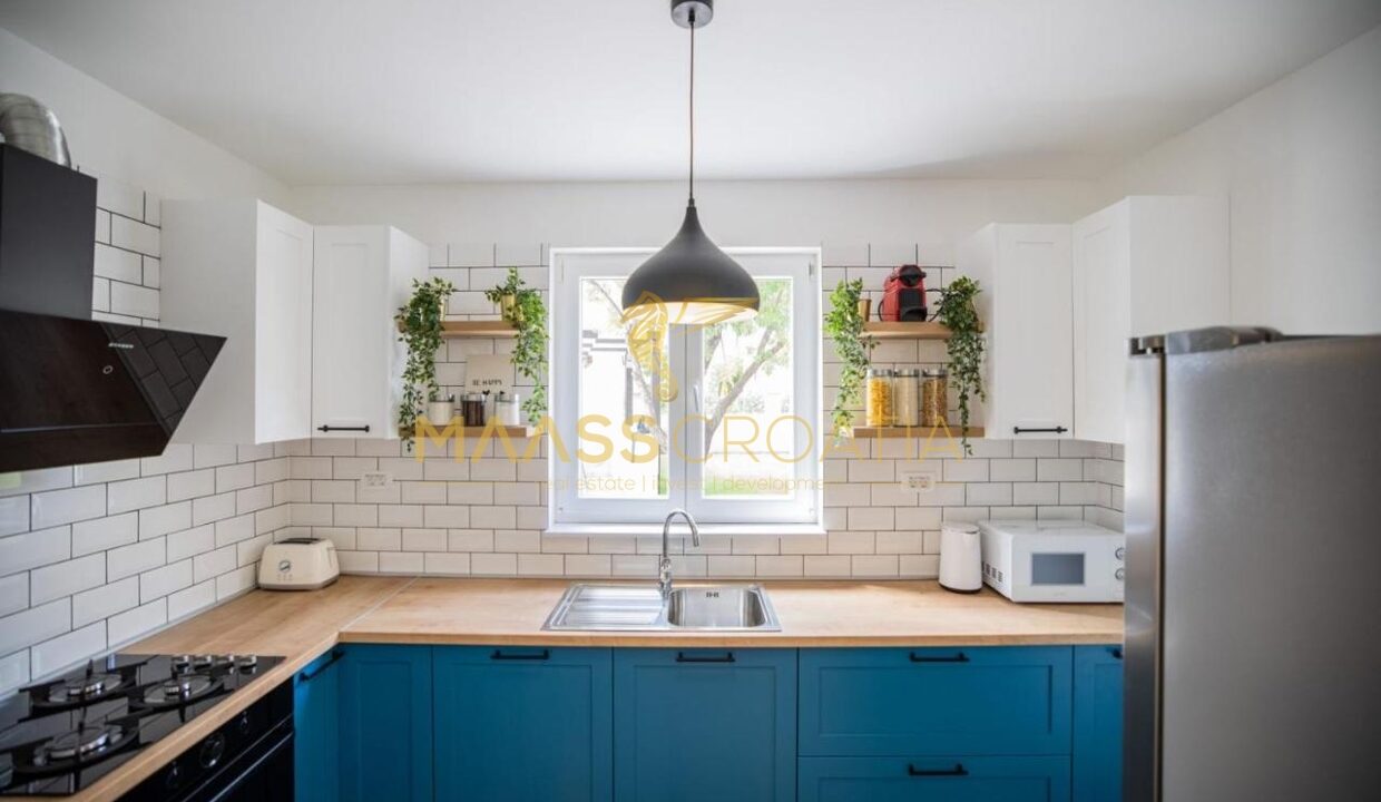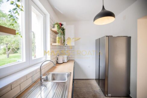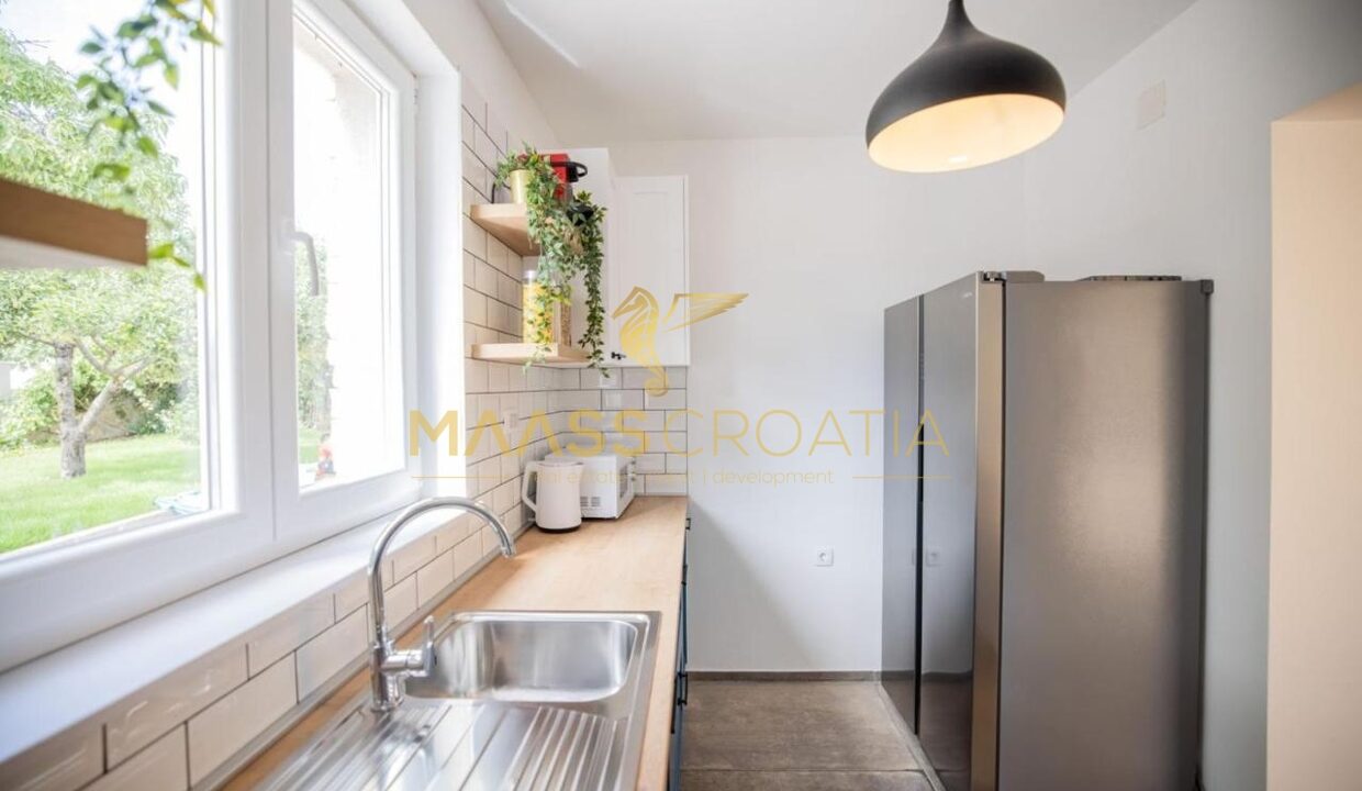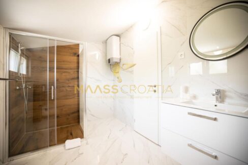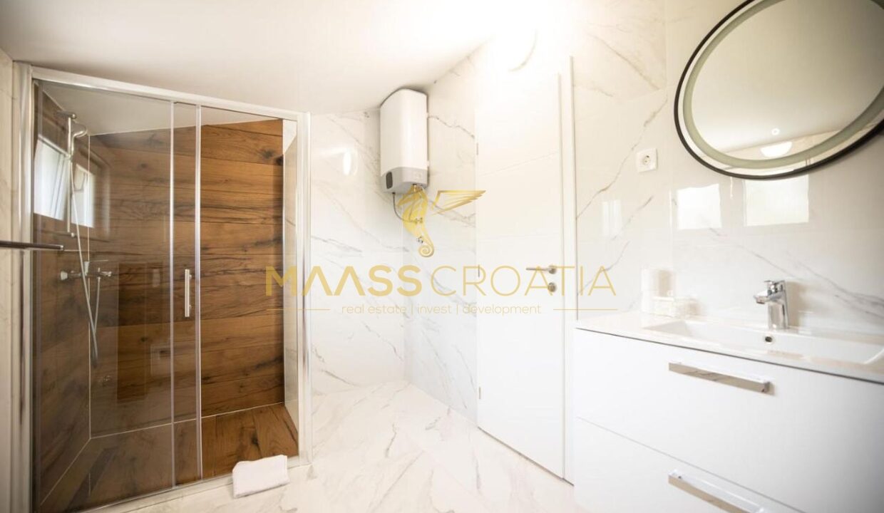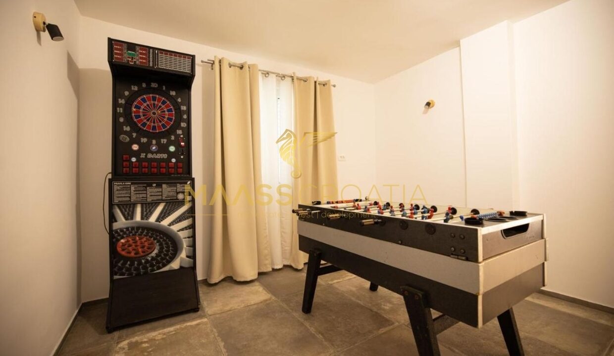 Перед виллой находится открытый бассейн с подогревом, шезлонгами и зонтиками, большое джакузи на 5 человек, зона для барбекю и уютный стол на 10 человек. Вилла расположена на полностью огороженном участке площадью 575 м² с высотой забора 130-180 см и зеленой зоной с различными породами деревьев и другими деталями, такими как камень Бенковац.