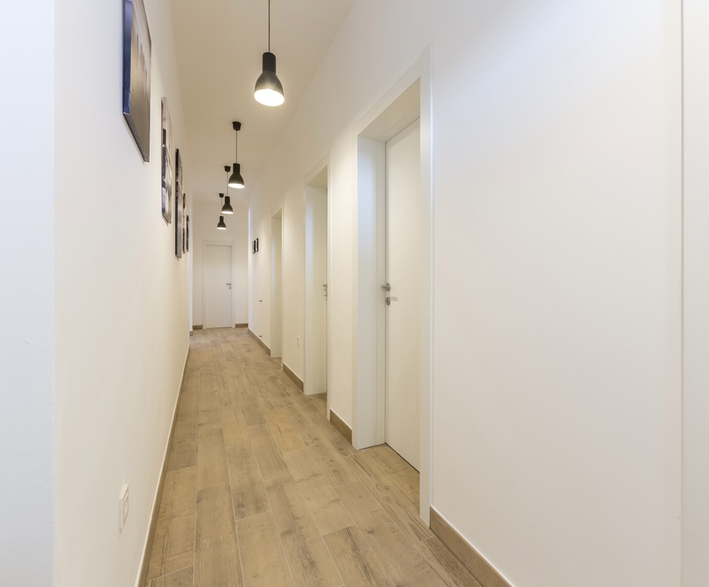 Потрясающие деревянные полы, современная система освещения и белые стены создают ощущение, что вы находитесь на выставке художника.