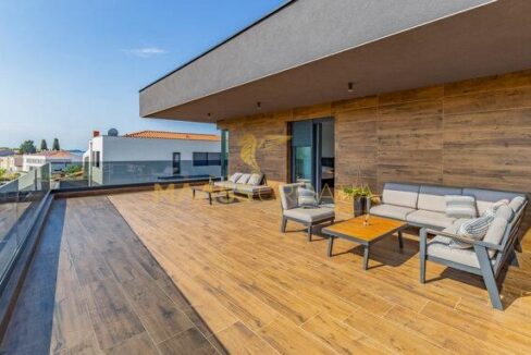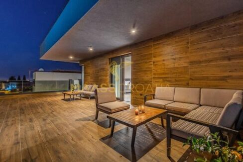 На верхнем этаже находятся 4 спальни с 4 ванными комнатами и исключительно большая терраса с видом на море, вековые сосны и закаты.