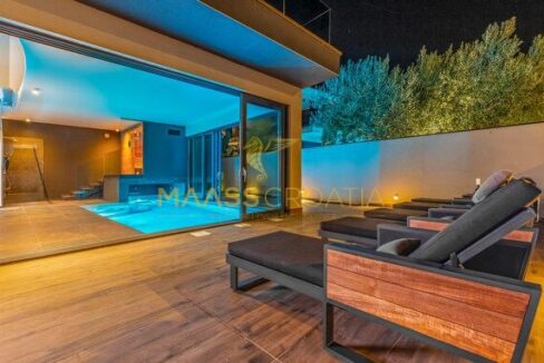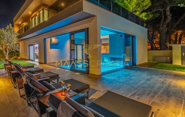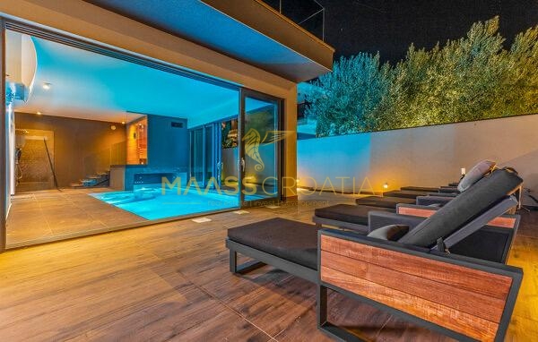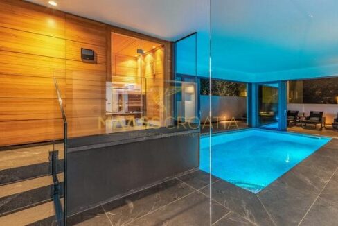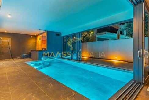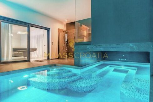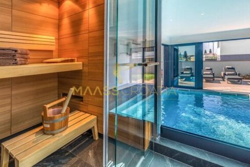 Она состоит из просторной гостиной с кухней и обеденной зоной, спальни, сауны с душем и крытого/открытого бассейна на первом этаже.