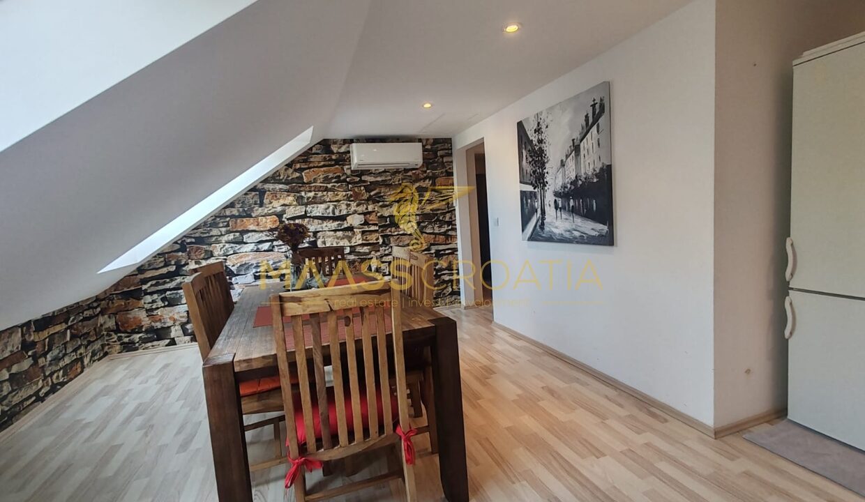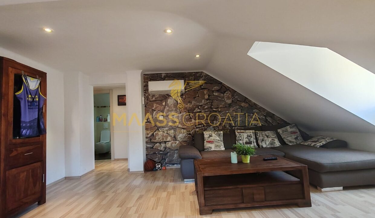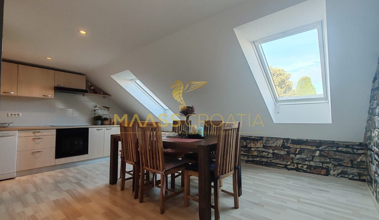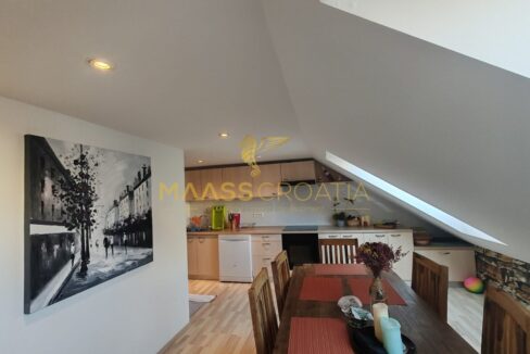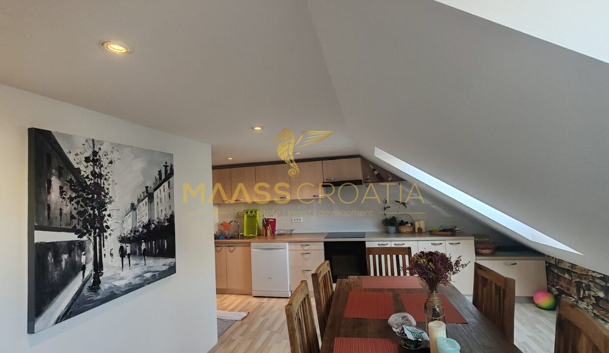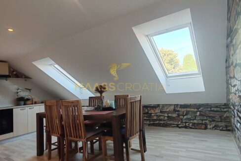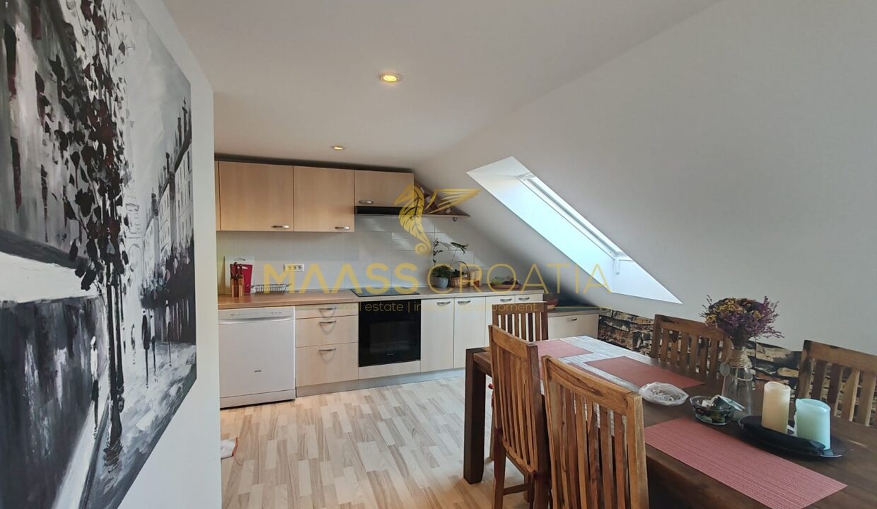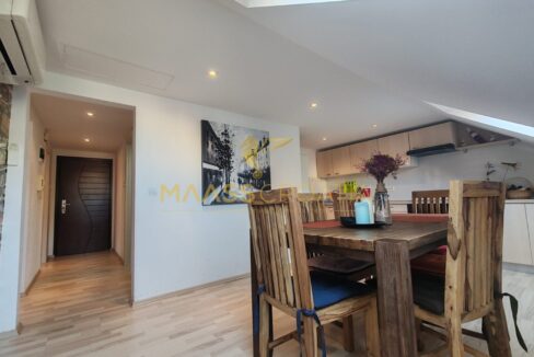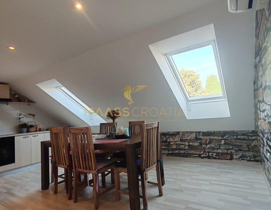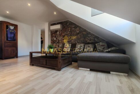 Она состоит из спальни, просторной гостиной, кухни с обеденной зоной, ванной комнаты и кладовой. Квартира оснащена мансардными окнами Velux с дистанционным управлением, кондиционером и ламинатом на полу по всей квартире.