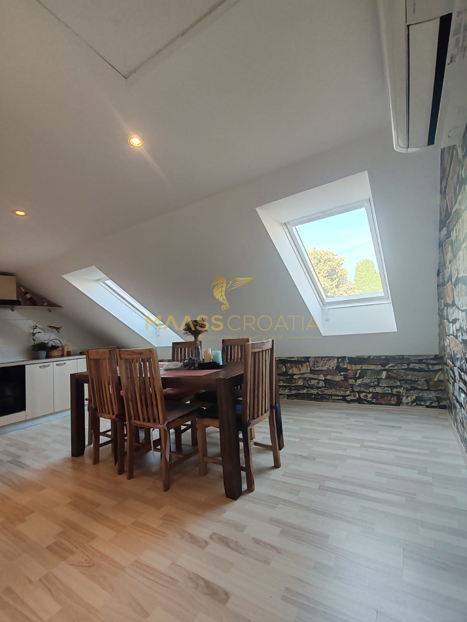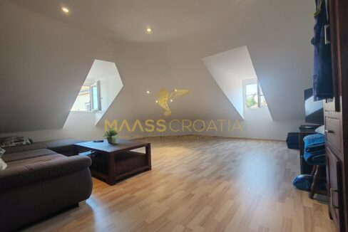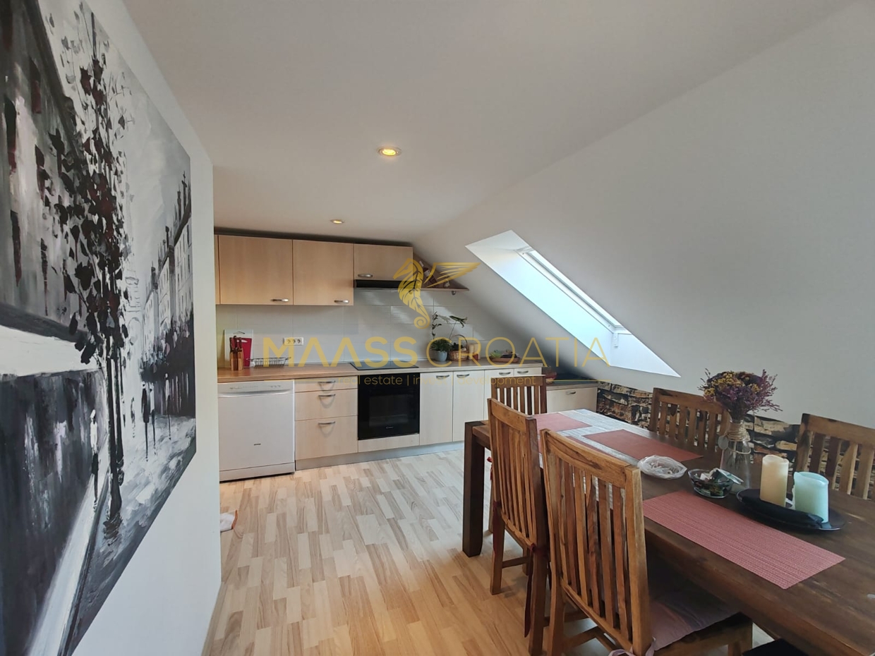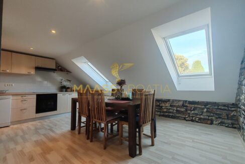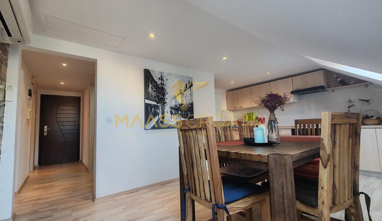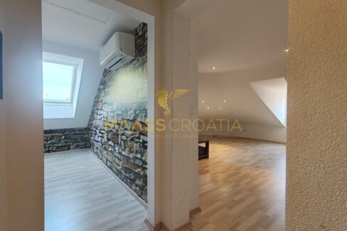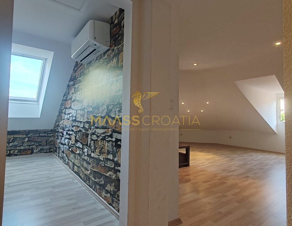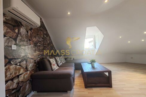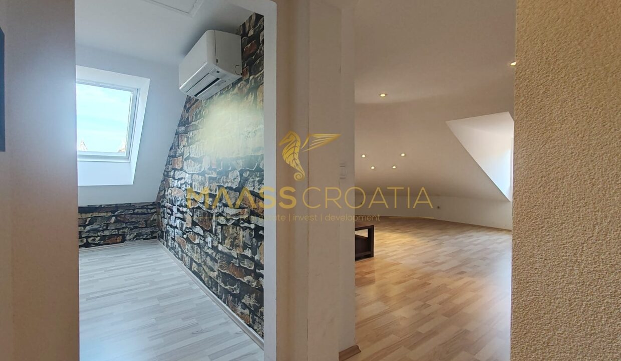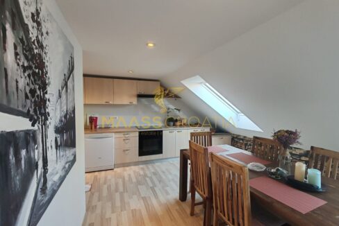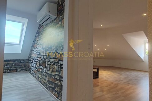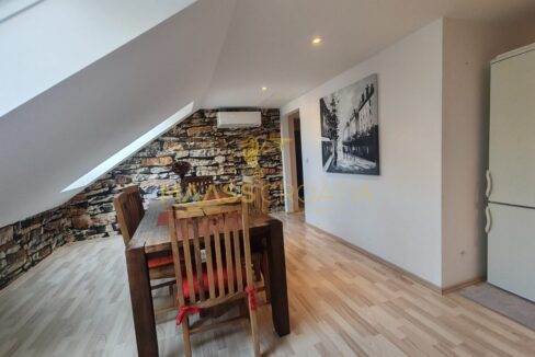 Она состоит из спальни, просторной гостиной, кухни с обеденной зоной, ванной комнаты и кладовой. Квартира оснащена мансардными окнами Velux с дистанционным управлением, кондиционером и ламинатом на полу по всей квартире.