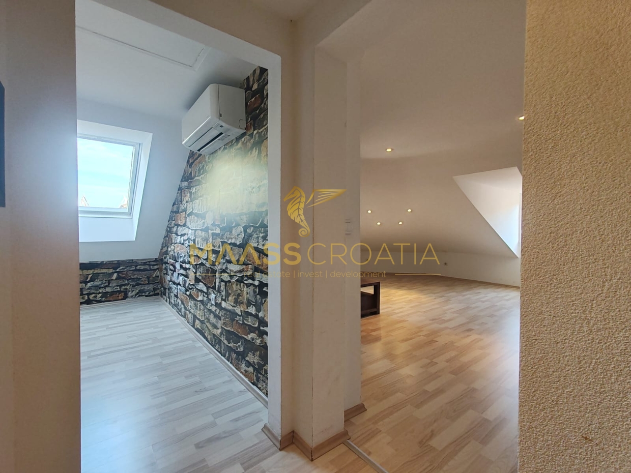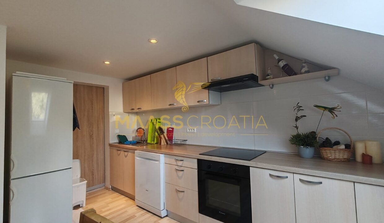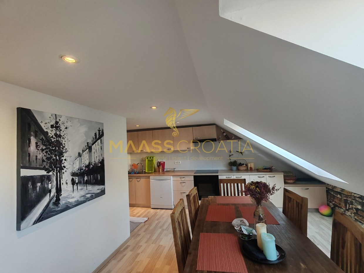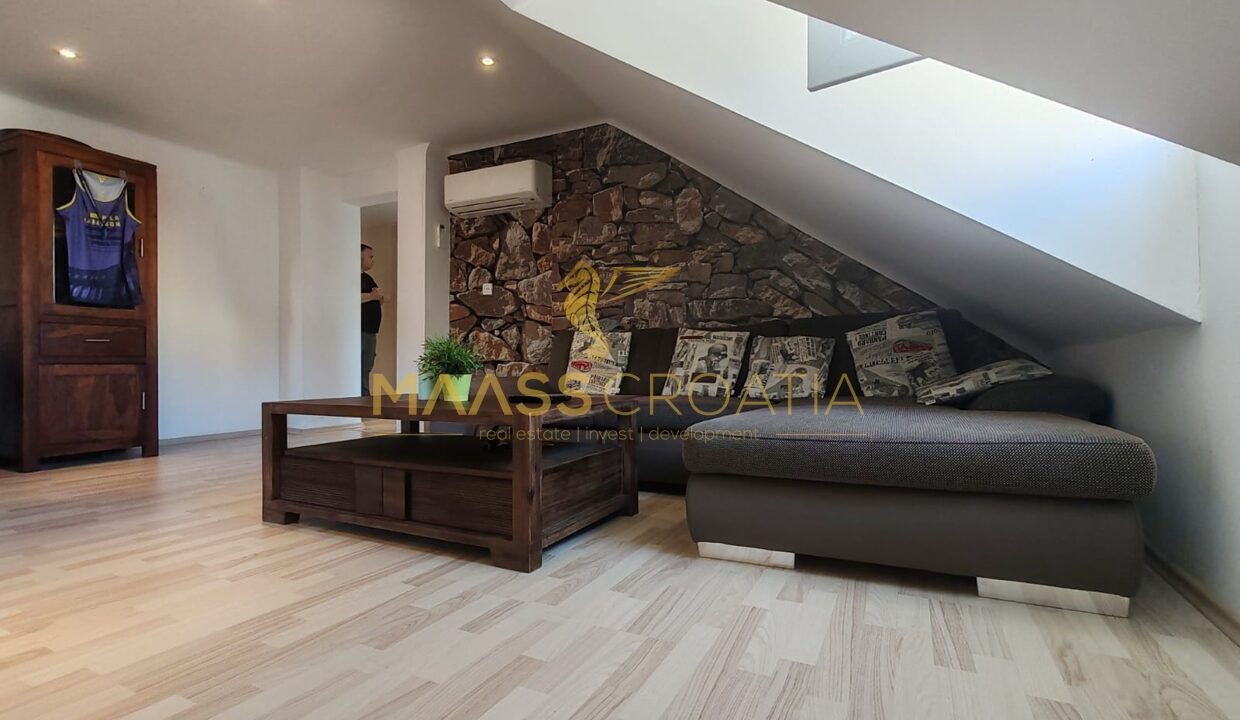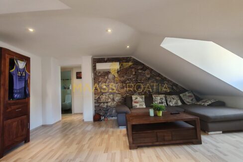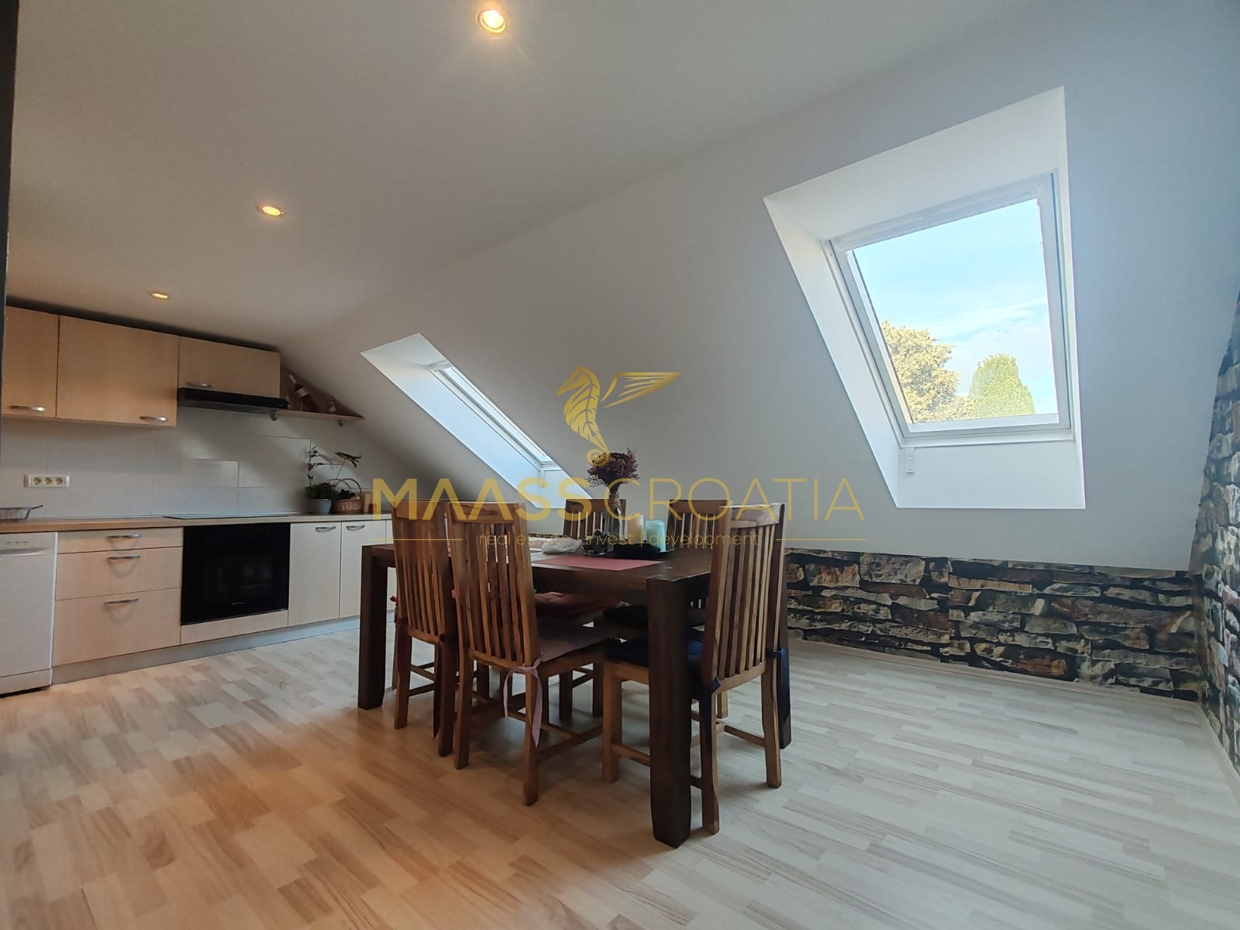 Она состоит из спальни, просторной гостиной, кухни с обеденной зоной, ванной комнаты и кладовой. Квартира оснащена мансардными окнами Velux с дистанционным управлением, кондиционером и ламинатом на полу по всей квартире.