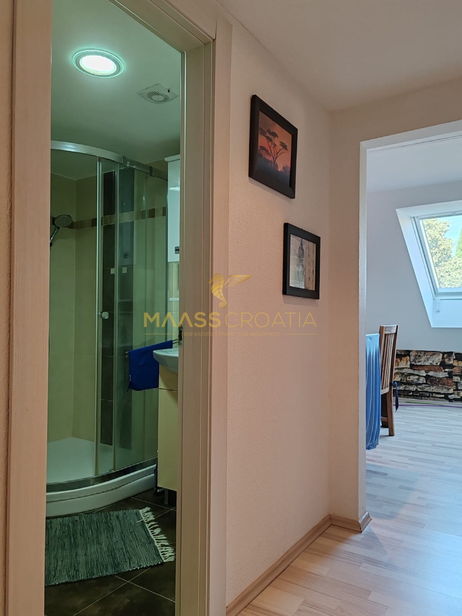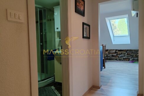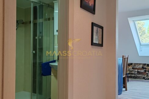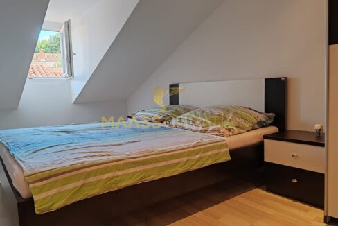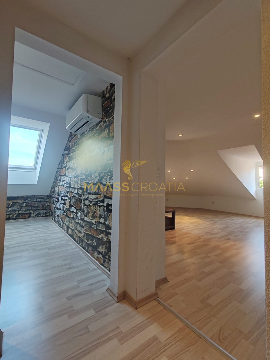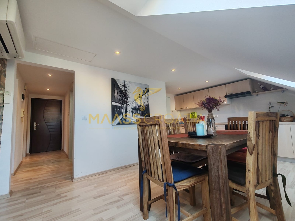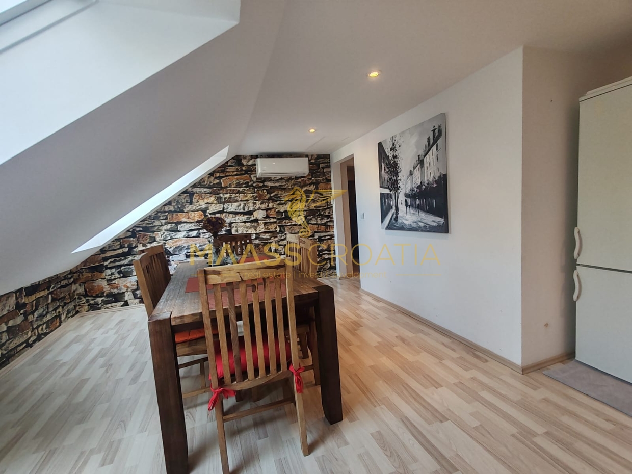 Она состоит из спальни, просторной гостиной, кухни с обеденной зоной, ванной комнаты и кладовой. Квартира оснащена мансардными окнами Velux с дистанционным управлением, кондиционером и ламинатом на полу по всей квартире.