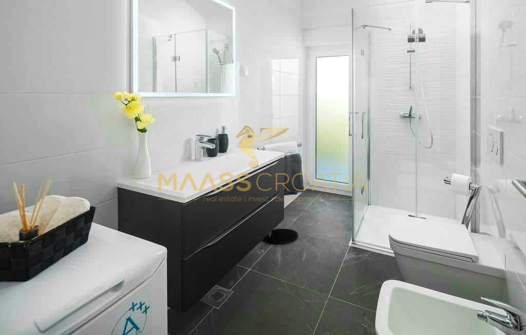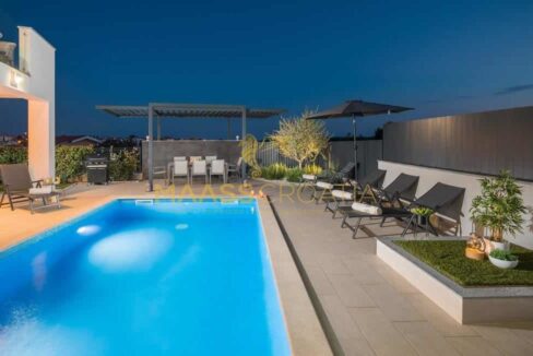 В жилом районе Медулин, на холме Мукалба, с панорамным видом на море и всего в 150 м от него, находится высококачественная вилла с архитектурным дизайном, построенная из отборных материалов и отличающаяся простой формой, высоким качеством и функциональной организацией пространства.