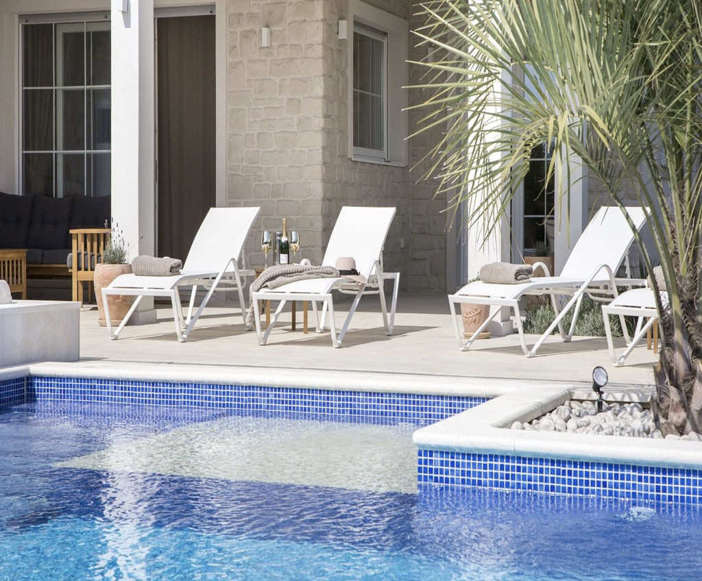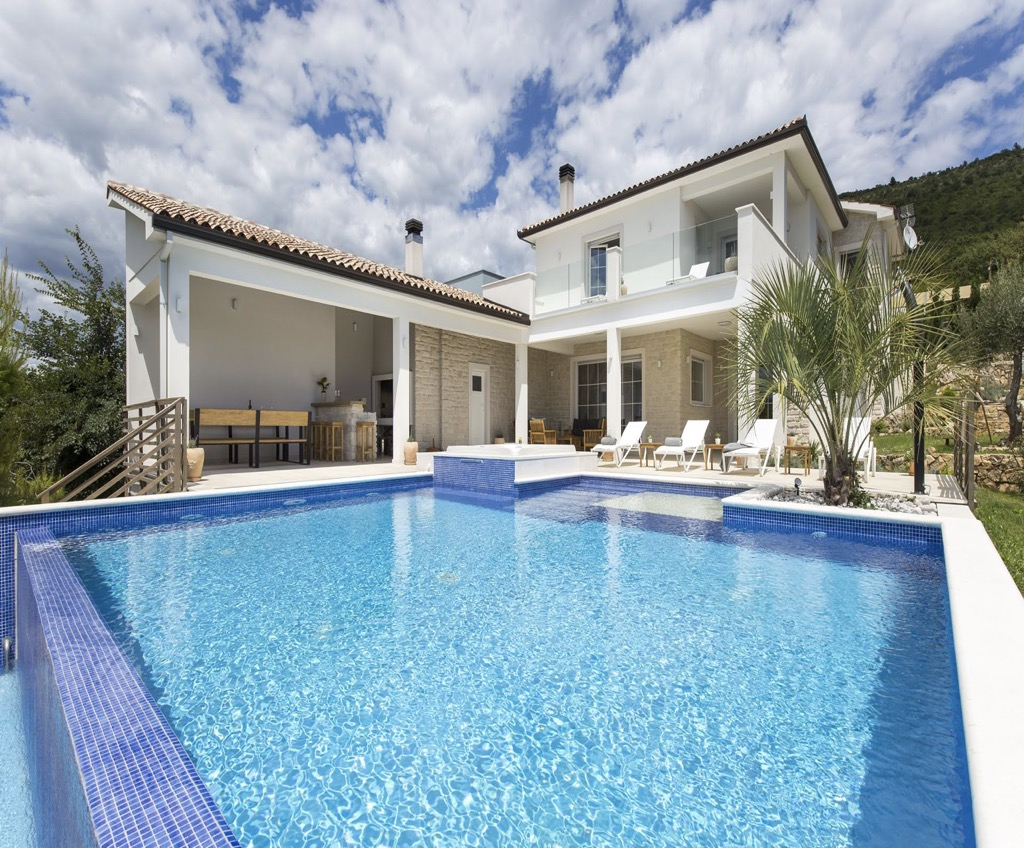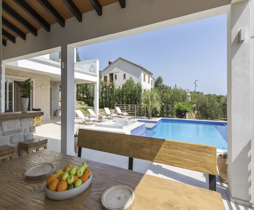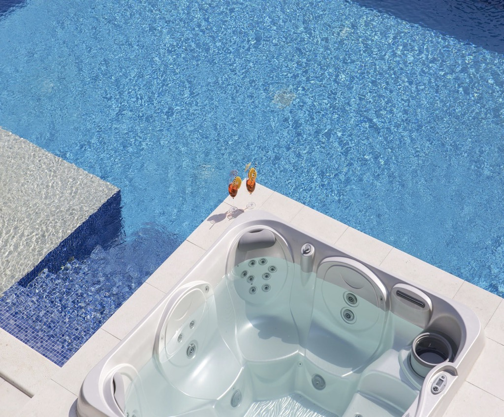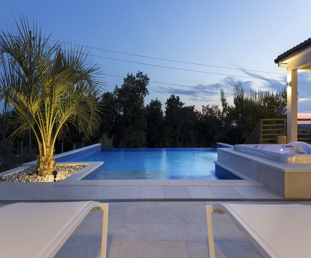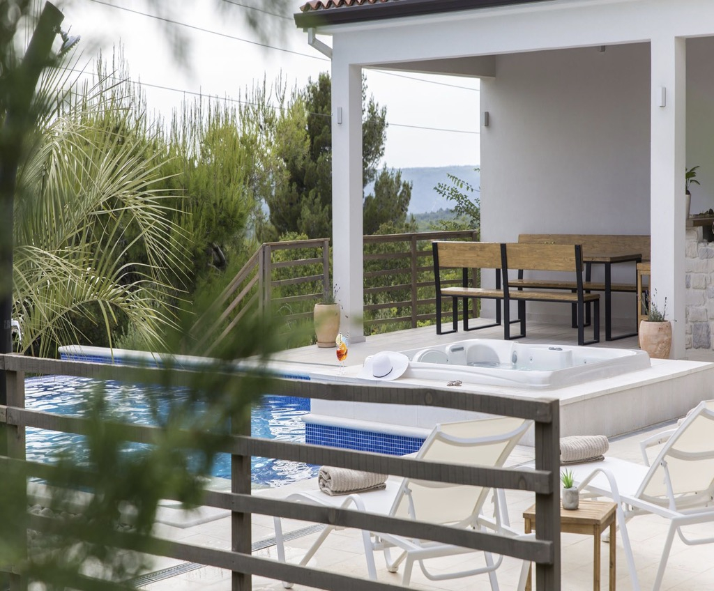 Здесь есть бассейн со встроенным джакузи, который напрямую соединен с террасой и зоной отдыха.