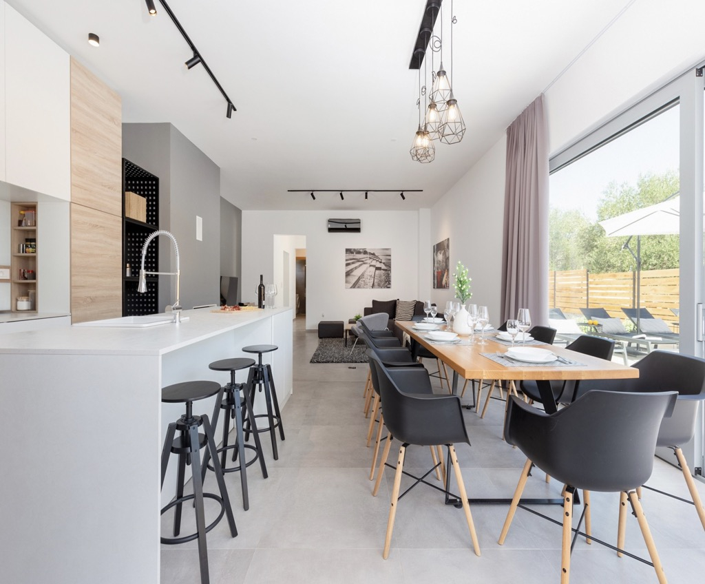 Внутренняя столовая соединена с открытой террасой огромными раздвижными стеклянными дверями, которые делают переход извне внутрь почти плавным и незаметным, как будто все это одно большое открытое пространство.