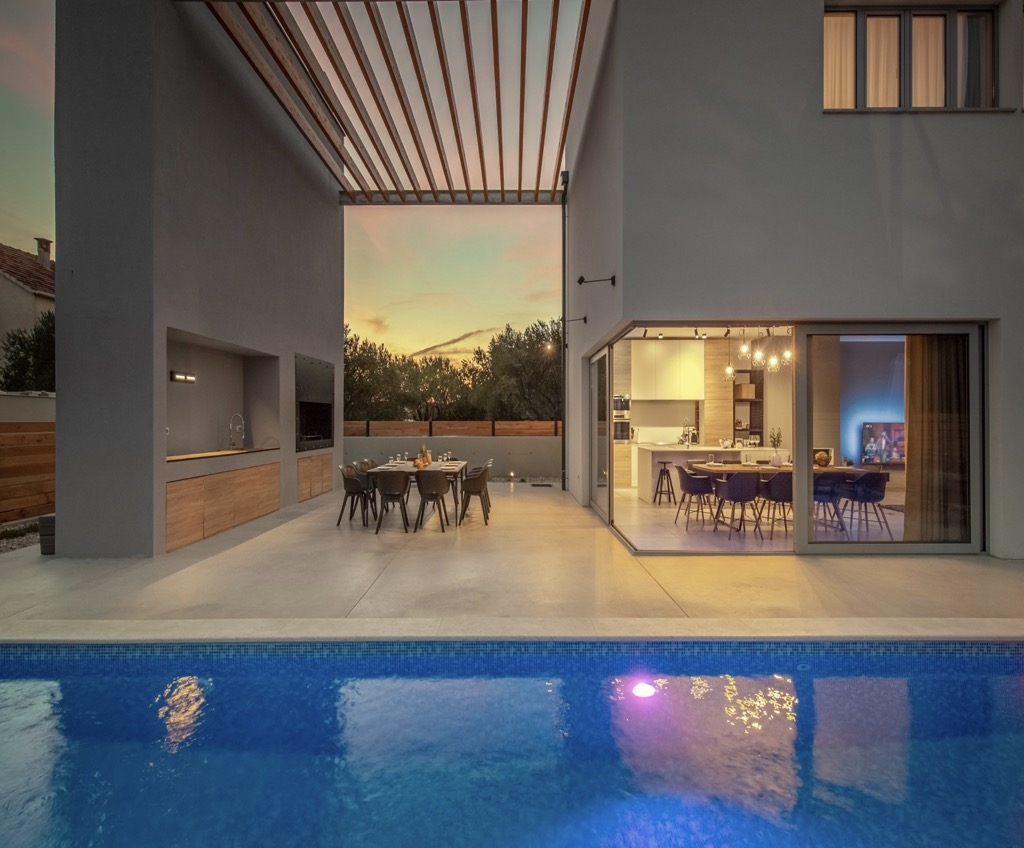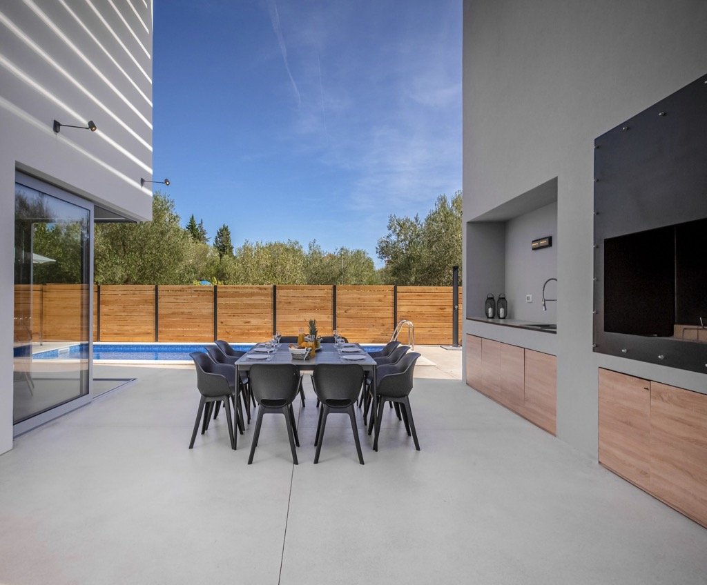 Снаружи есть просторная терраса с зоной отдыха и ультрасовременной кухней на открытом воздухе, а также большой бассейн, который подчеркивает всю атмосферу и делает ее еще более роскошной.