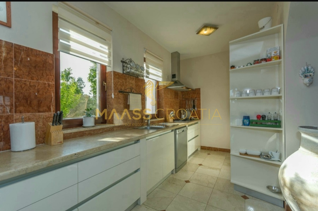 На первом этаже также расположены открытая, полностью оборудованная, современная кухня, две столовые с подходящей мебелью, еще одна гостиная с диванами, гостевой туалет и спальня с современной ванной комнатой. В этой части виллы также имеется смежная комната. Массивная каменная лестница соединяет цокольный этаж с первым этажом. где расположены 2 спальни с двуспальными кроватями, две ванные комнаты и терраса с уникальным видом на весь сад и богатое содержимое этого элегантного и изящного шедевра. Выход с первого этажа резиденции ведет в красивый внутренний дворик, где находится оригинально задуманная и спроектированная крытая летняя гасиенда, мебель для отдыха и барбекю. Это пространство идеально подходит для общения и отдыха в хорошей компании и с первоклассным гастрономическим предложением, которым широко известен регион Истрия. На участке также имеется гостевой дом площадью 50 кв. м с гостиной открытого плана, кухней, спальней и ванной комнатой.