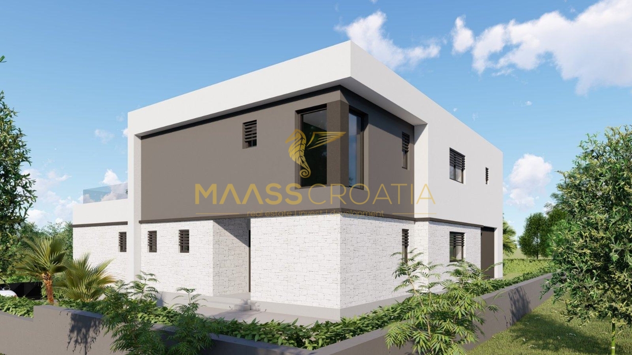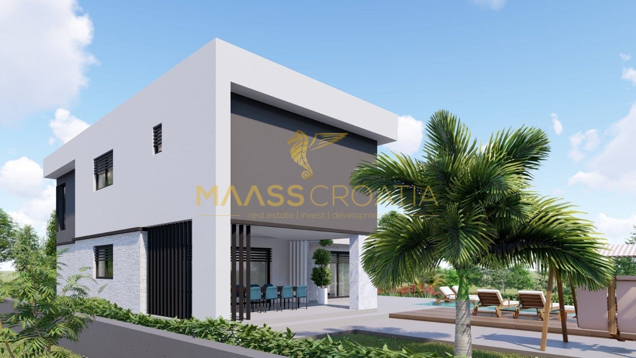 Продается участок под застройку площадью 260 м² с проектом строящейся виллы класса люкс, расположенный в Марчане, в тихом районе, окруженном оливковыми рощами и открытыми сельскохозяйственными угодьями. Вилла имеет современный дизайн, бассейн-инфинити, большие террасы и панорамные виды на Учку, Велебит и Црес.