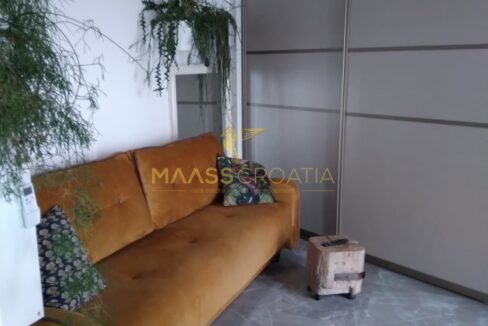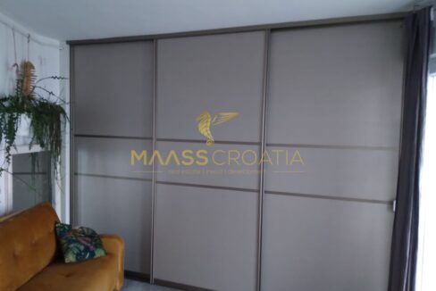 Квартира полностью функционально меблирована и оборудована: встроенный шкаф с большим количеством мест для хранения и скрытой полкой для обуви рядом с входом, функциональная кухня, полностью оборудованная посудой и техникой, и обеденная зона.